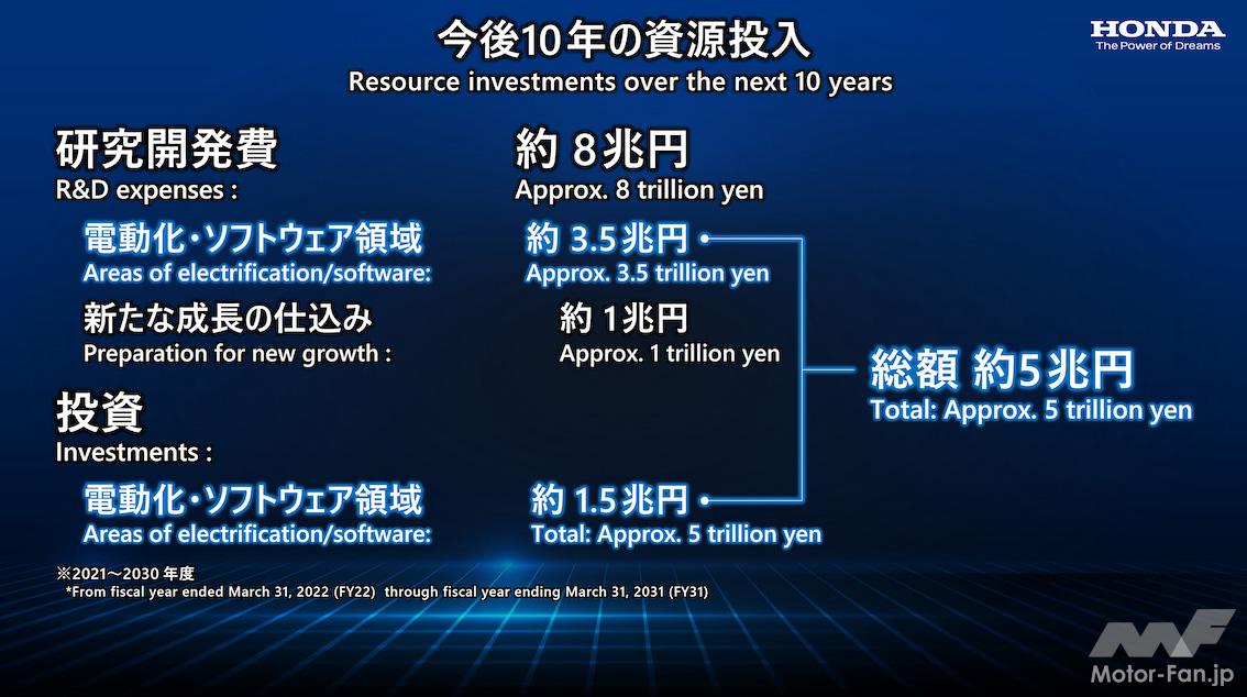 まず、BEVの車種数は2030年までに30車種をグローバルで投入する。2030年時点でのBEVの生産台数は200万台を計画している。ホンダの世界生産を500万台とすると、2030年では5台に2台がBEV(その他はハイブリッド)になるというわけだ。