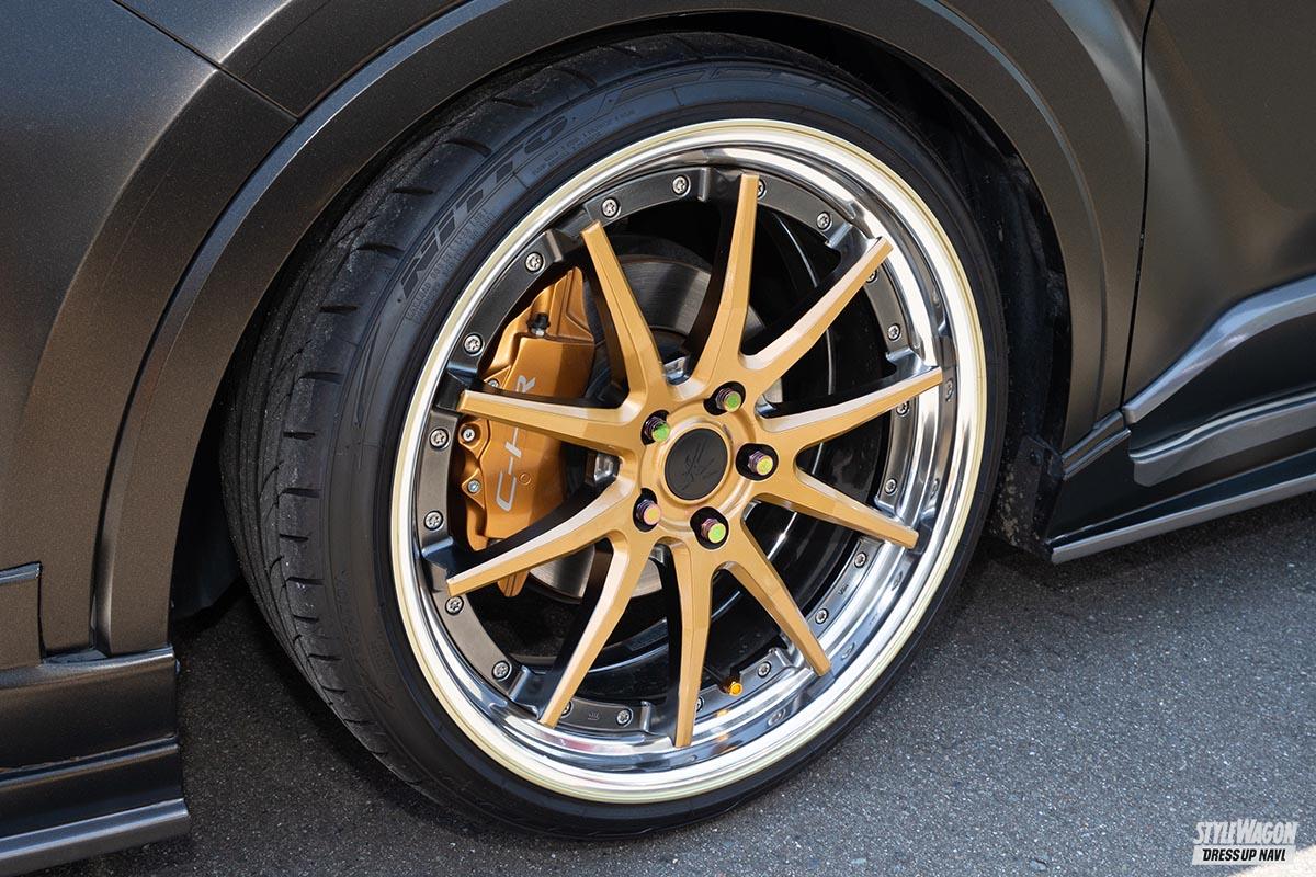 4WDグレードをベースに、ボディはゴールドダストブラックという、マジョーラ風のラッピングでイメージを一新! さらに右サイドはガンメタ、左サイドはゴールドと、色調を変えたKUHLのヴェルズホイールで独自の個性を主張。エアロはヴァルドをメインに、ロェンのグリルやシルクブレイズのリアゲートスポイラーを組み合わせる。