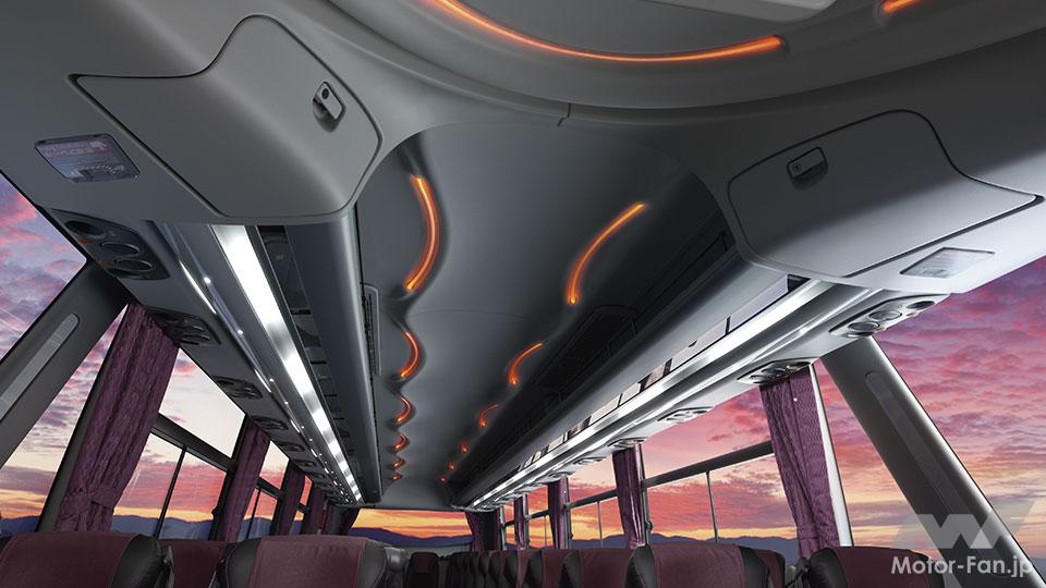 さて、『日野 セレガ』の2代目モデルは、“弾けるような元気─そして、おもてなしの心”をデザインコンセプトに、乗客がバスに対面した瞬間から楽しい旅を予感できるようなデザインを狙いとしています。外観ではオリジナリティあふれるアクセントピラーとオーナメントランプ、室内ではドーム天井と自動車用で初採用となるLEDファイバー照明など癒しの空間を演出する照明デザインが特長で、広い荷物棚、フラットフロアなど機能的にも優れたものとなり、2005年グッドデザイン賞の栄誉も獲得しています。また、前後パネルにはFRP樹脂を採用し、板金プレスでは難しいディティールが表現できたことも特徴の一つです。