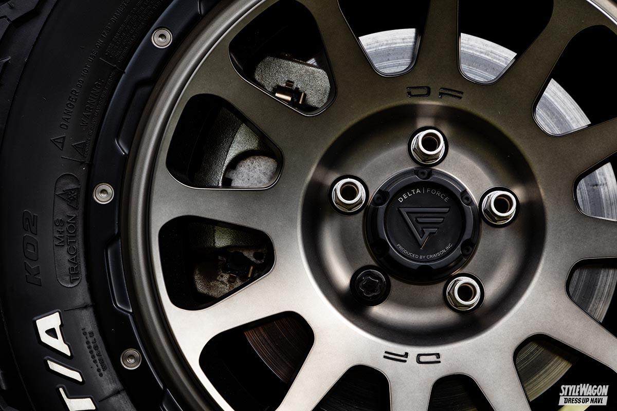 となると候補としてハズせないのが現在、オフスタイル界を強烈に牽引中なデルタフォースのオーバル。オフ系定番のサークルホールディッシュだが、その窓が丸ではなく六角形となるため、個性もしっかり主張できる。リムフランジは鉄板のビードロック仕立てとなるためワイルド感も強く、大きくコンケイブしたフェイスは力感もたっぷりだ。