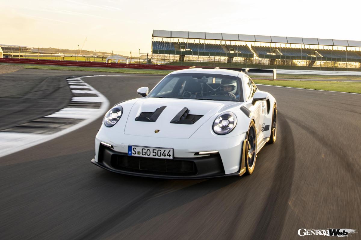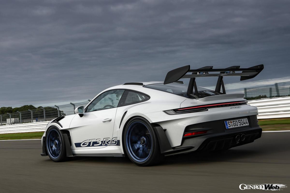新型GT3 RSはレーシングカー並みの大型エアロパーツを多数搭載しているため、ボディサイズは先代より拡大。一方、CFRP素材を活用した軽量化施策により、車重の増加はできる限り抑え込んでいる。