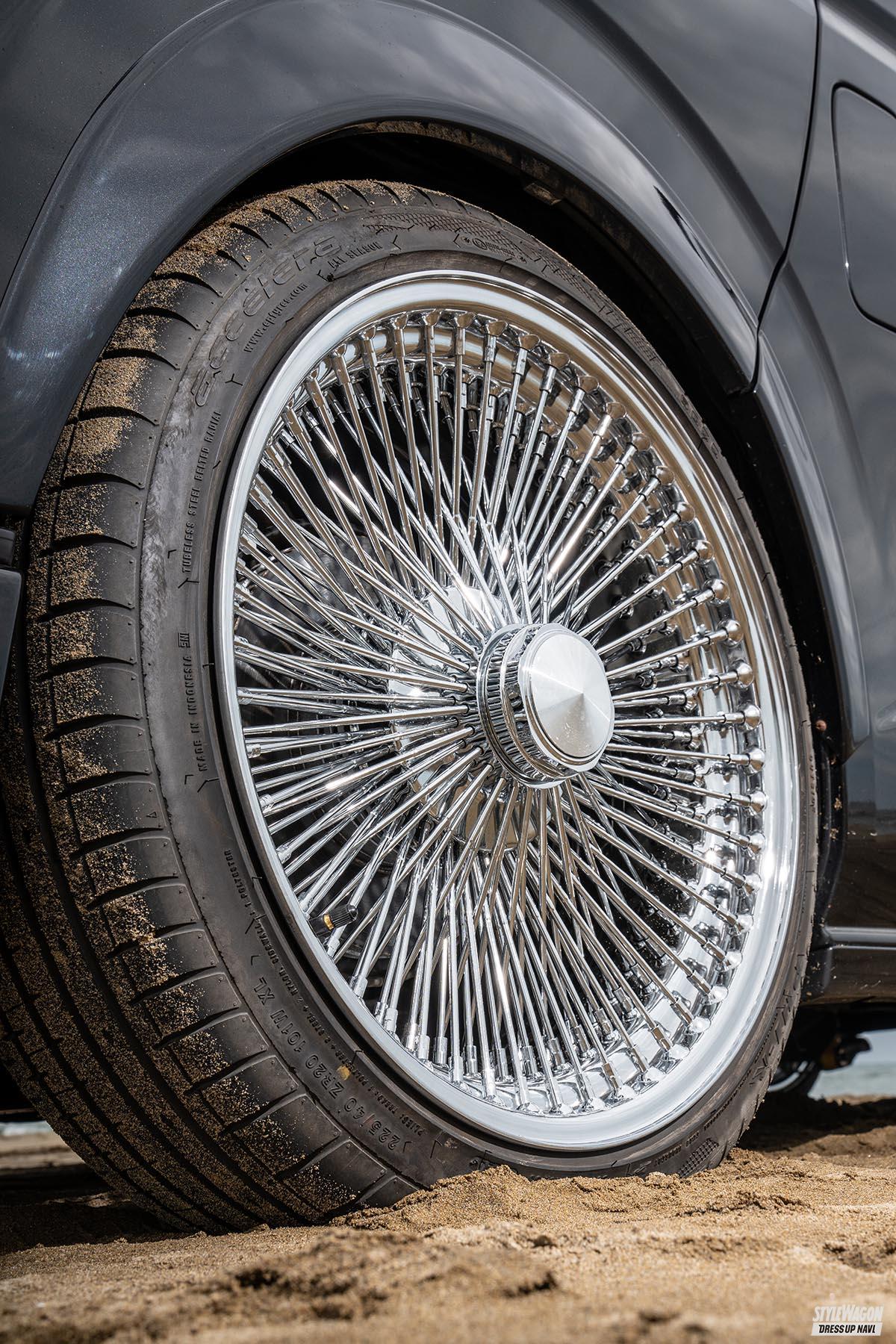 肝となるのは往年のローライダーを彷彿とさせるワイヤースポークホイールとシンプル極まりないイン&エクステリアの小悪魔的フィニッシュ。加えて車高調による極低フォルムをキープしたまま4WDによる越冬地での走破性をキープしているのも興味深い。