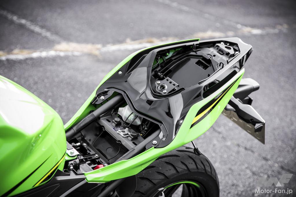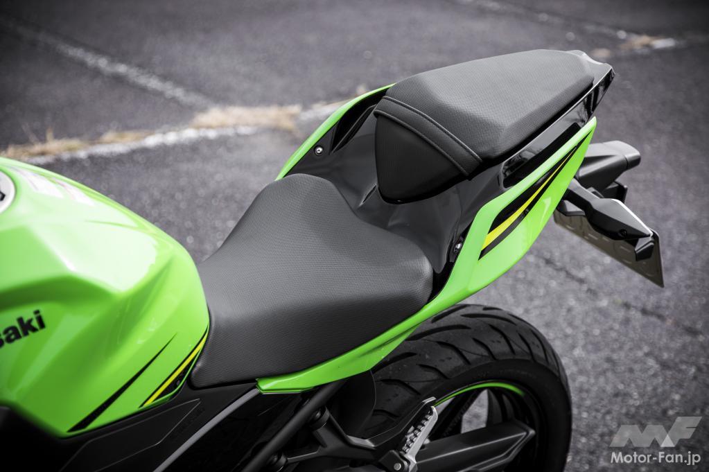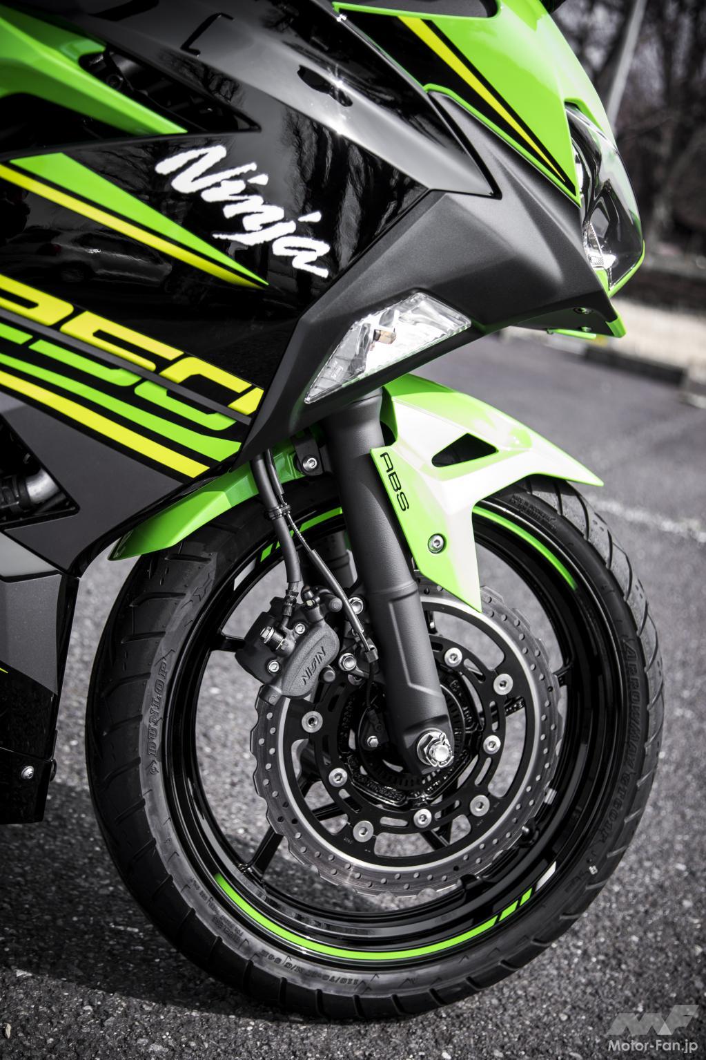 ボア・ストロークこそいずれの車両もショートストロークタイプ(Ninja250:ボア62.0mm×ストローク41.2mm)だが、今回は新開発された高圧縮比エンジンを搭載。吸排気系やインジェクターが刷新された他、冷却性能や軽量化、メカニズム部分の低フリクション化が徹底されている。削り出しバランサーシャフトの採用で震動対策も万全だ。エキゾーストパイプも太くなり、31psだった最高出力は37ps/1万2500rpm、最大トルクは2.3kgm /1万rpmを発揮する。