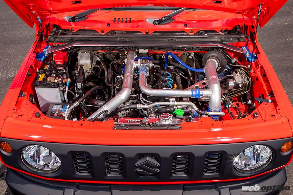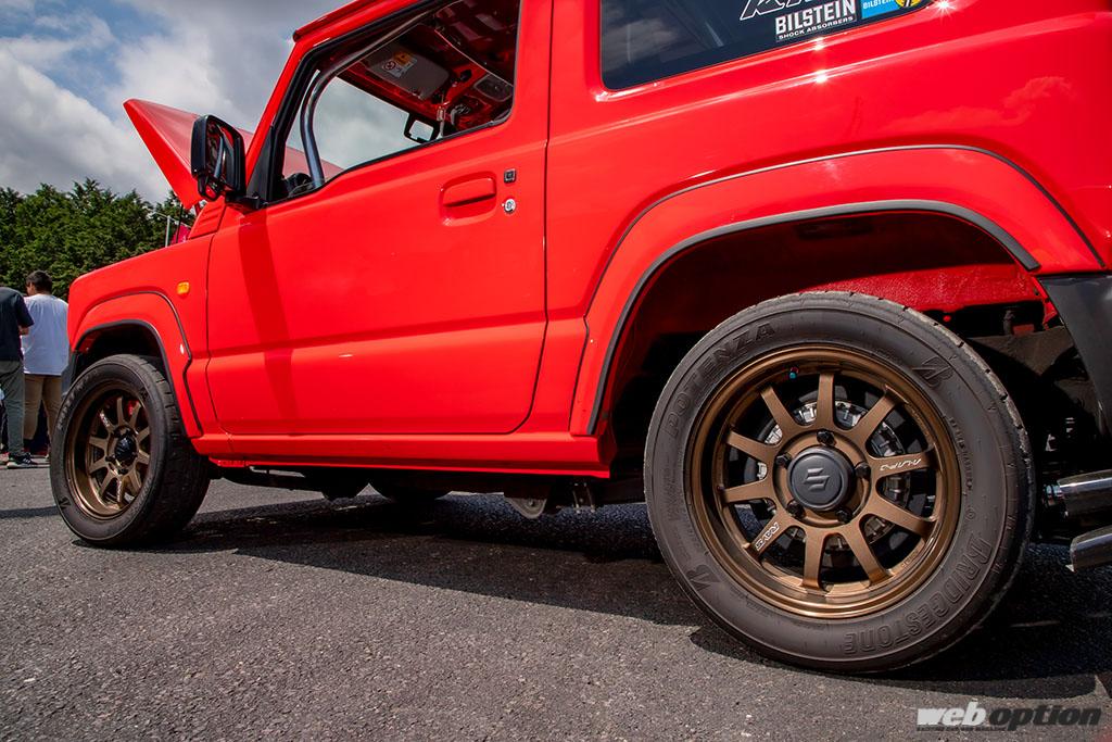 ベースはJB64Wで5速マニュアルのXLだ。サーキット走行を前提としているため、スペアタイヤは当然のようにキャンセル。フェンダーは9mmワイドになるGベース製で、GTウイングはワンオフラダーを介して理想的な位置にマウントしている。