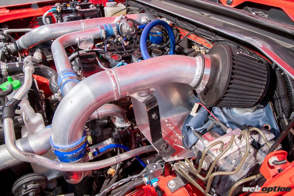 タービンは純正改のハイフロー仕様をテスト中。現状、ブースト圧は0.9キロの設定だが、まもなくインジェクターと燃料ポンプを大容量化して1.3キロ(130ps)にチャレンジするそうだ。