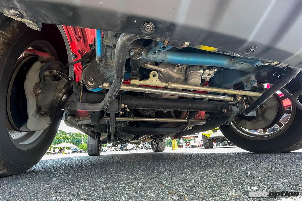 足回りはオリジナルの前後50mmダウンサス(F6kg/mm R5kg/mm)でセットアップ。車高はサーキットで縁石をまたぐようなシーンまで想定した設定だ。また、駆動系はフロントのトランスファーを撤去し、完全FR仕様としているのもポイントだ。
