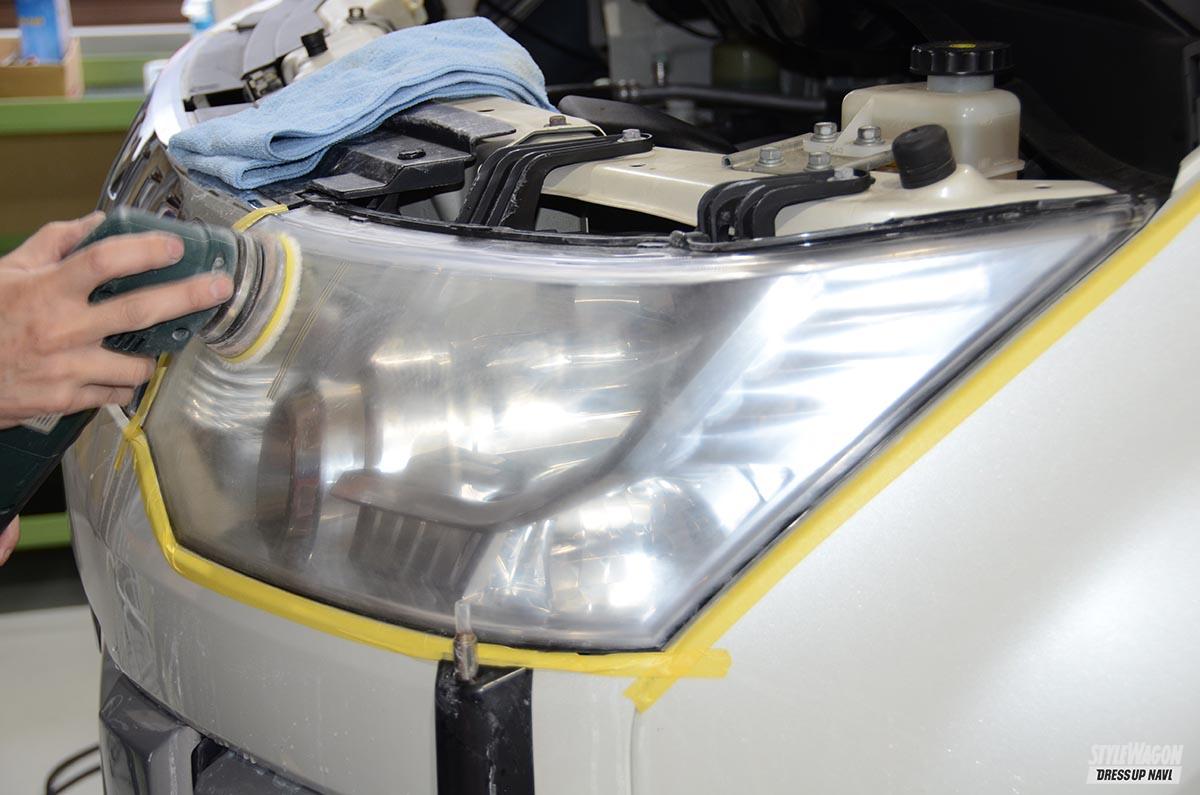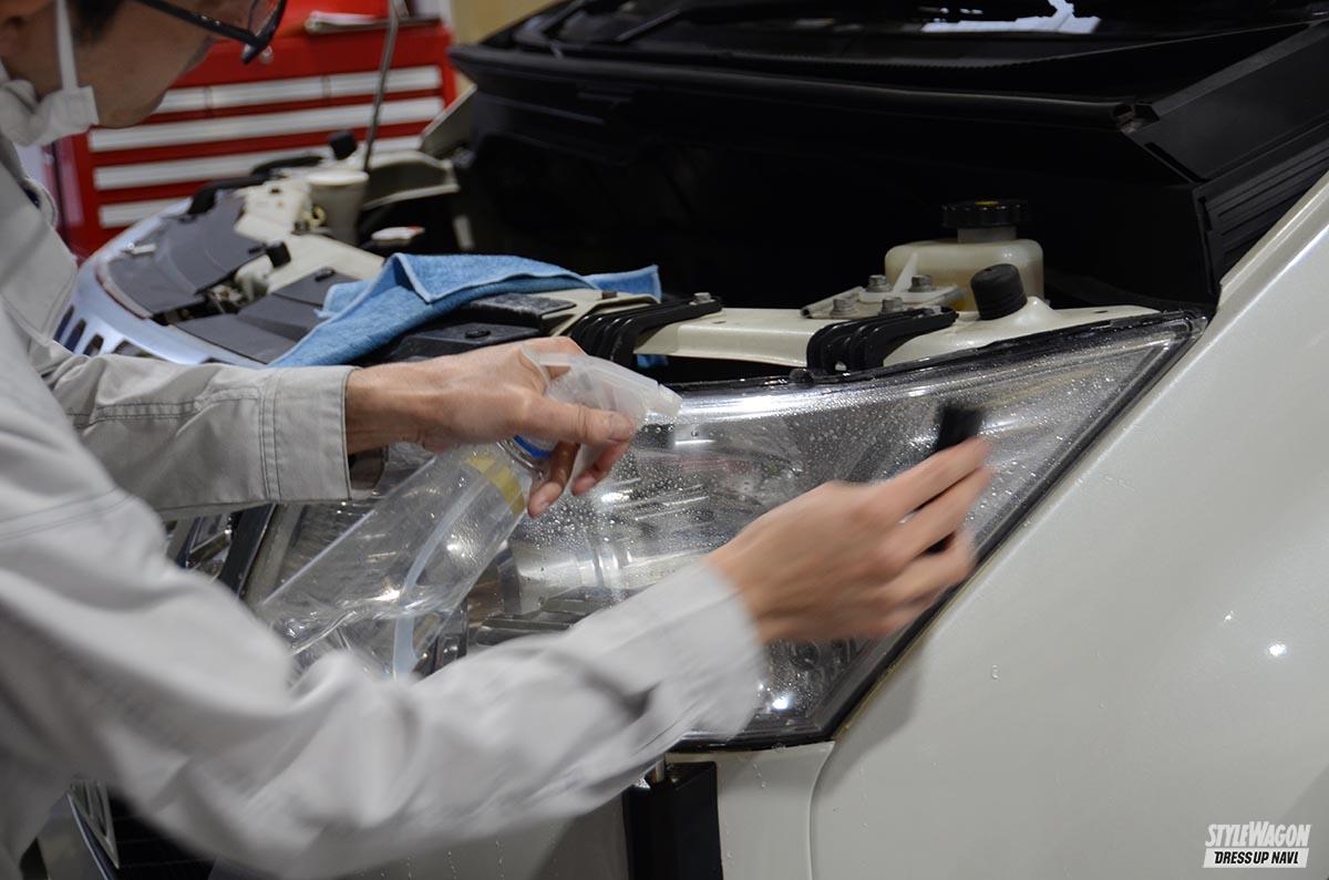 人間に例えると、歳とっても若々しく見せるには、顔のシミを隠すとか、目の下のたるみをとるとかいろいろ方策はあるけれど、クルマの場合はなんといってもヘッドライト。ここが曇っていたり黄ばんでいたりしたら、とてもくたびれて見えてしまう。そこでXPELのヘッドライトクリアプロテクタを施工することに。まずは現状のヘッドライトを磨くところからだけど、流石に18万キロも走行しているデリカなだけに、キズ全部の修復はちょっとムリだったけれど、このフィルム貼ることでこれからのプロテクションはバッチリ。末永く若々しい顔面でいられるハズだ。