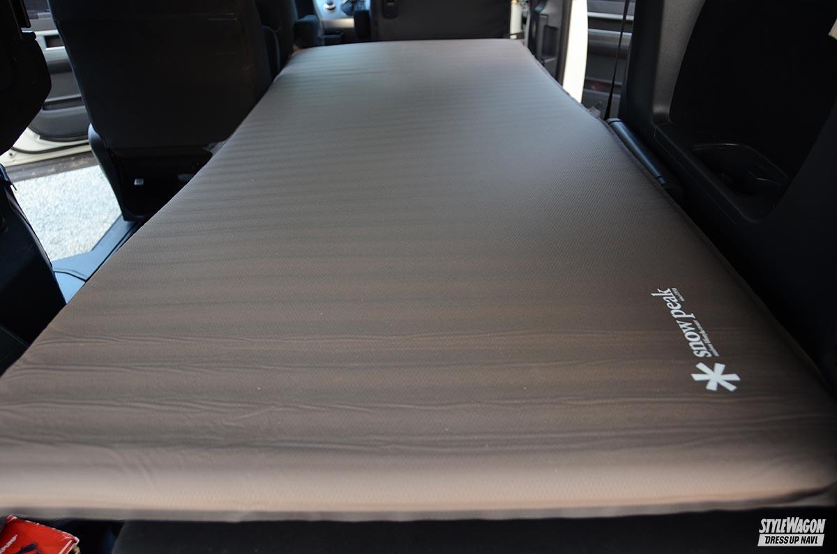 というわけで車中泊、試してきました山中湖畔。本人の身長173cm。スノーピークのマットが全長2mほどあるので、シートたたんでのフロアでは長さが足りない。1そこで2〜3列目シートでフルフラットモードにするも、デリカの場合はシートバックを倒した時に絶望的なくらいにできてしまう段差をどうクリアするかが課題。2そこはニトリで買ったクッションを敷いてなんとかクリア。34その上にマットを敷いて、シュラフという構成。実際寝てみて段差はほとんど気にならず。起き上がって履き物履くのもテントで起き上がってよりも遙かに快適だった。