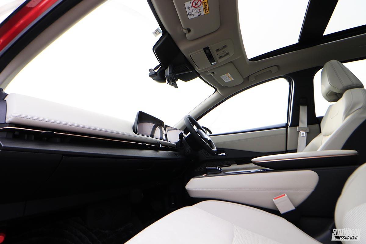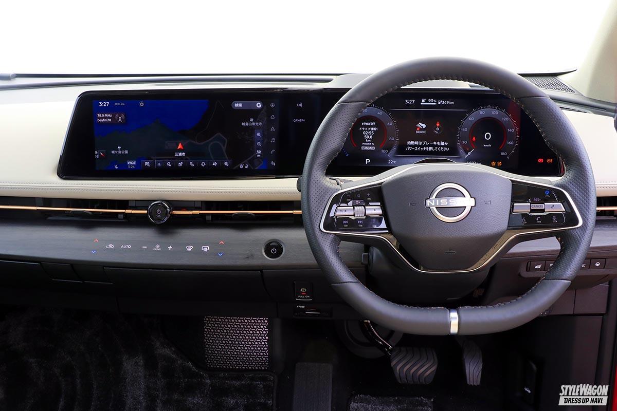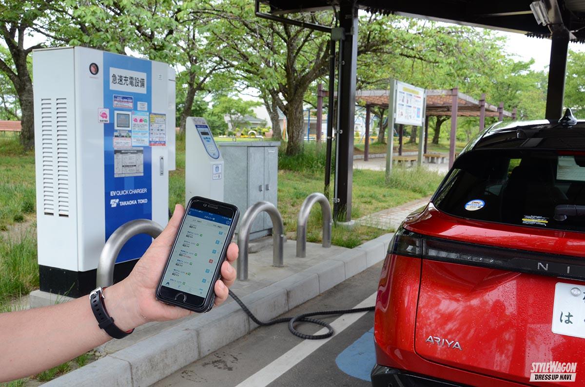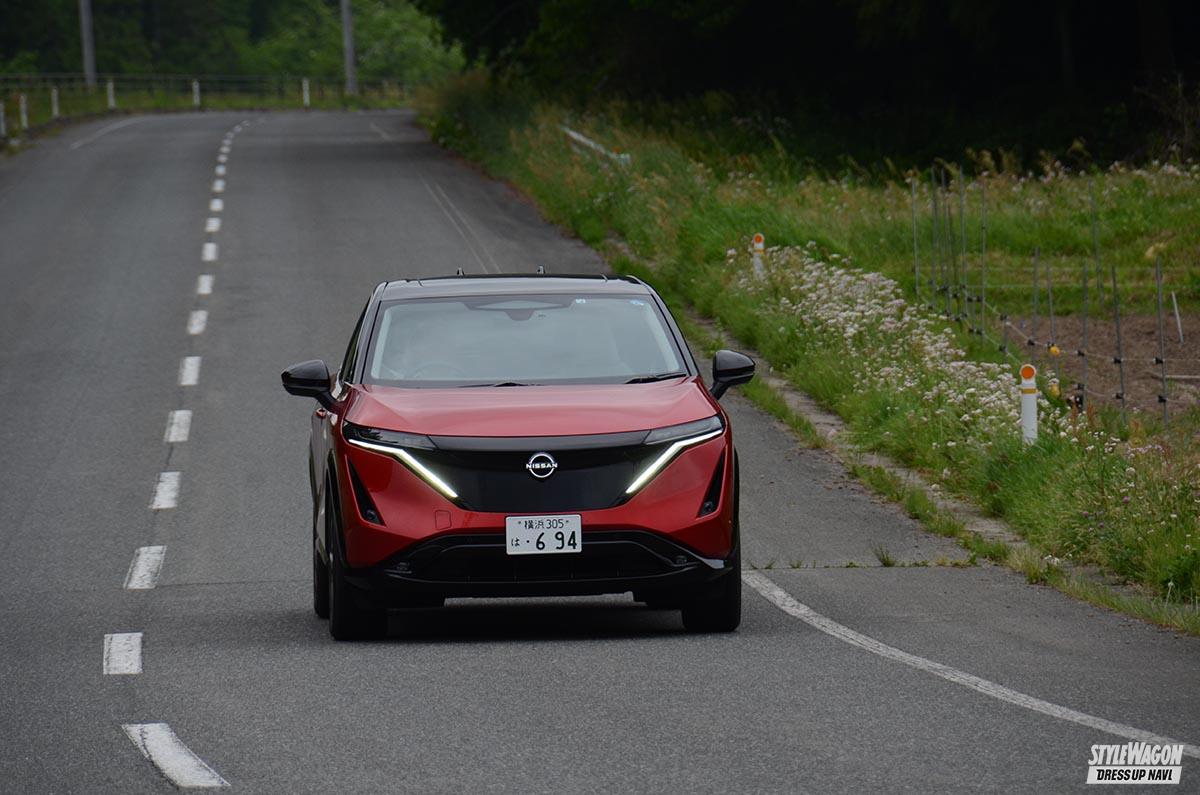 ドライブのパートナーは日産の最新BEVであるアリア。B6/2WDというベーシックなモデルながら、66kWhのバッテリーを搭載し、一充電走行距離はWLTCモードで470㎞を実現。「バッテリー温調」を備え、繰り返しの急速充電でも効率よく電気を貯めてくれるので、ロングドライブの心強い味方となる。