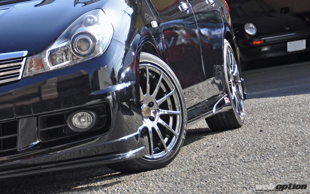 足回りはテインのスーパーワゴンサスペンションを軸に構築。スタイリッシュなホイールはエンケイのSC03(7.0J-17+45)、タイヤにはポテンザRE05(205/455-17)を組み合わせる。