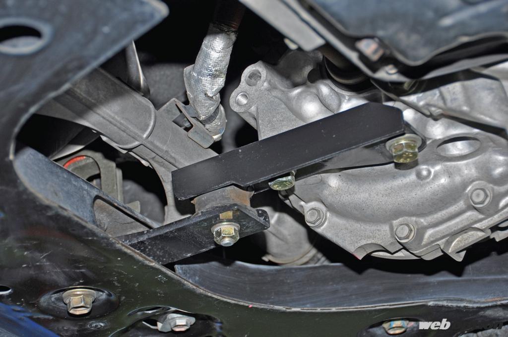 エンジンのパワーアップに伴い、エンジン&ミッションケースとフロントメンバーを繋ぐ補強マウントを製作。さらに強化ウレタンブッシュを使うことで剛性を高め、クルマの動きをシャープにするシャーシ系のチューニングも施される。
