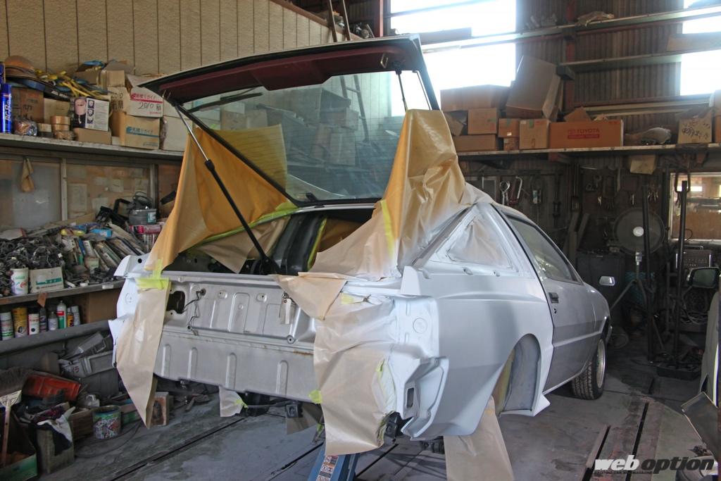 工場で製作が進められるスタリオンは、初期の1年しか生産されなかった幻のNAグレード2000GXがベース。110ps/16.7kgmのG63Bキャブ仕様を搭載し、リヤサスが4リンクリジッド式となる珍種だ。ボディは2600GSR-VRの部品取り(!!)からフェンダーを移植してワイド化を実施。エンジンはG63B改4G63ヘッドのソレックスツインキャブ仕様を予定しているそうな。