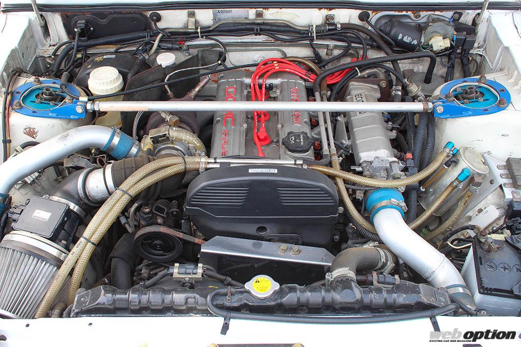 また、布田さんにとってスタリオンと並ぶ魅力的な存在が、同じくFRレイアウトのA17系のランサーだ。所有車の中でも古株なのが、この1986年型後期A175A。こちらのエンジンも布田さんならではのノウハウが満載で、クランク角センサーを加工して4バルブヘッドを流用。サージタンクはFE700系キャンター用で、タービンもTD06とTF06ハイブリッドのトラック用を使っている。