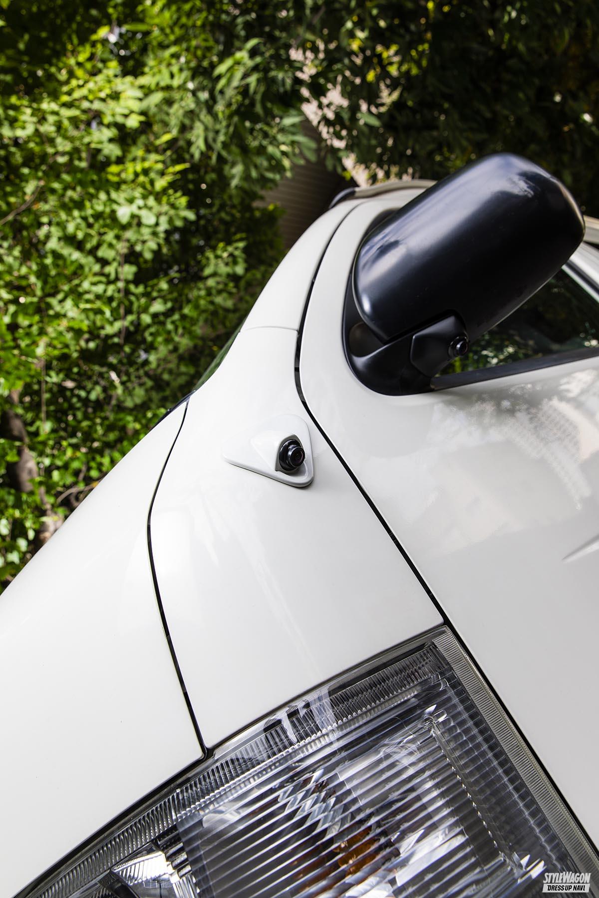 まずジムニー/ジムニーシエラ用は、前方と直前直左、後方の死角をカバーするカメラキット。ジムニーは足まわりをリフトアップして乗っているユーザーも多く、前方や左サイドがさらに見づらくなってしまう。カスタマイズを楽しみたい人にとっては必須アイテムと言える。フロントまわりはカメラ内蔵タイプのフロントグリル、純正グリルのエンブレムに追加するエンブレムフロントカメラキットをリリース。表情を変えたいならグリル、費用を抑えたいならエンブレムと好みに合わせて選べる。左サイドの死角は、車種別サイドカメラキットで解消。カバーは車種専用設計で、ドアミラーの台座に違和感なく馴染む。そして上から広範囲を映し出すハイマウントリアカメラキットを付ければ、スムーズに車庫入れできる。