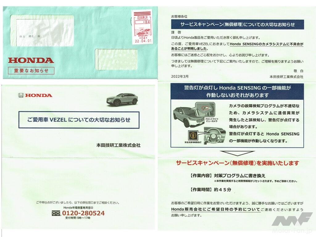 フロントワイドビューカメラの交換を終えた2日後、HONDAより「重要なお知らせ」の封書が届いた。それはまさにカメラシステムの不良によるサービスキャンペーン(リコールではない)のお知らせだった。内容的には「プログラムが不適切なため対策プログラムに書き換えします」というもの。筆者のヴェゼルは、すでにカメラ本球まで交換してしまったがプログラム書き換えだけで解決できたのか知る由もないが、時期的にプログラム書き換えで済むなら事前にサービスには伝えられているだろうしちょっと釈然としない。サービスキャンペーンがカメラ交換ではないので、もしかしたら筆者ヴェゼルのような初期ロッドと現在生産中のものとはカメラそのものが違うのかも知れない。気になったのでホンダのホームページで確認すると令和3年8月20日まで生産分が対象になっていた。初期ロッドででる不具合であることはわかったが、部品交換とプログラム書き換えだけの境目がわからずちょっともやもやしている。