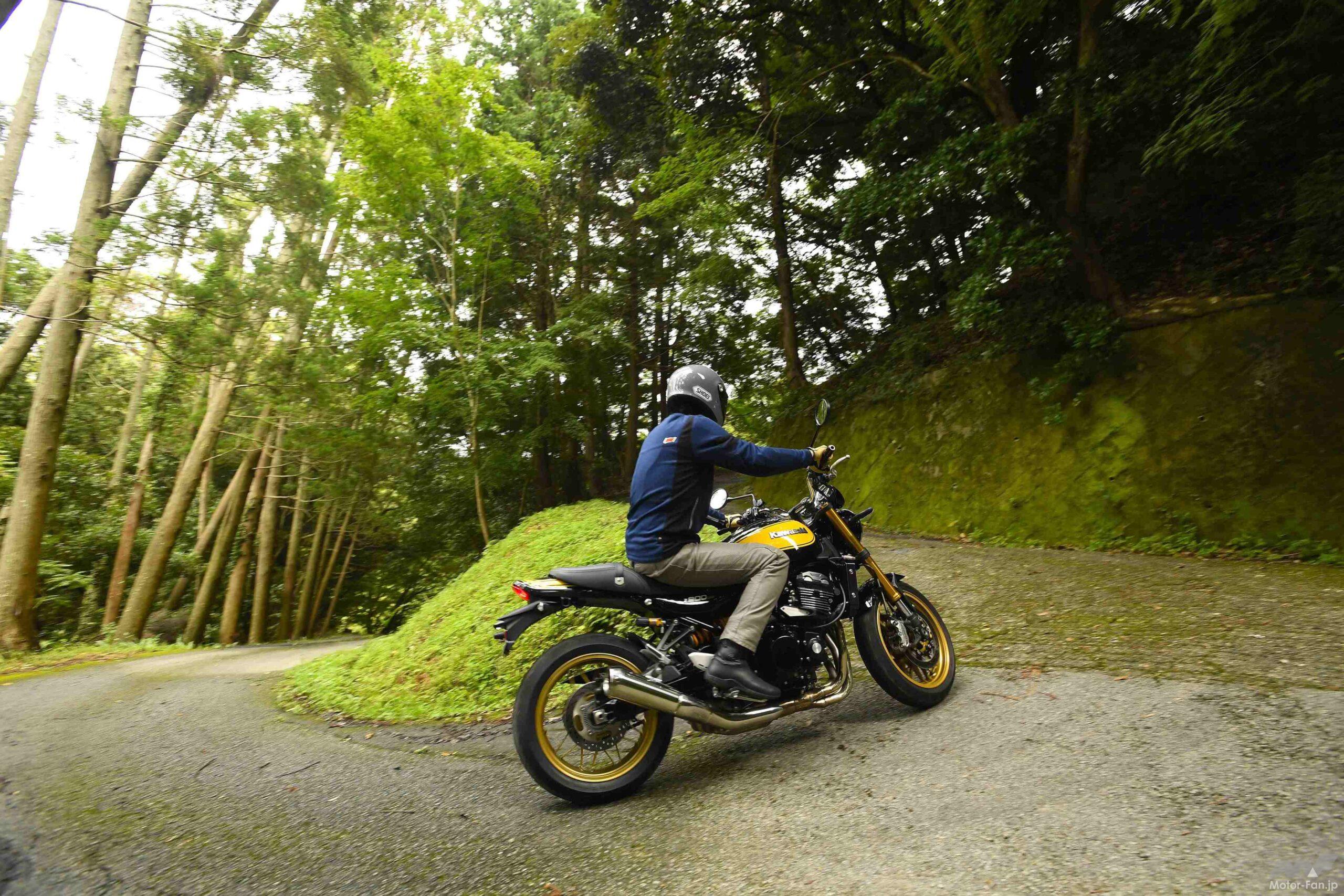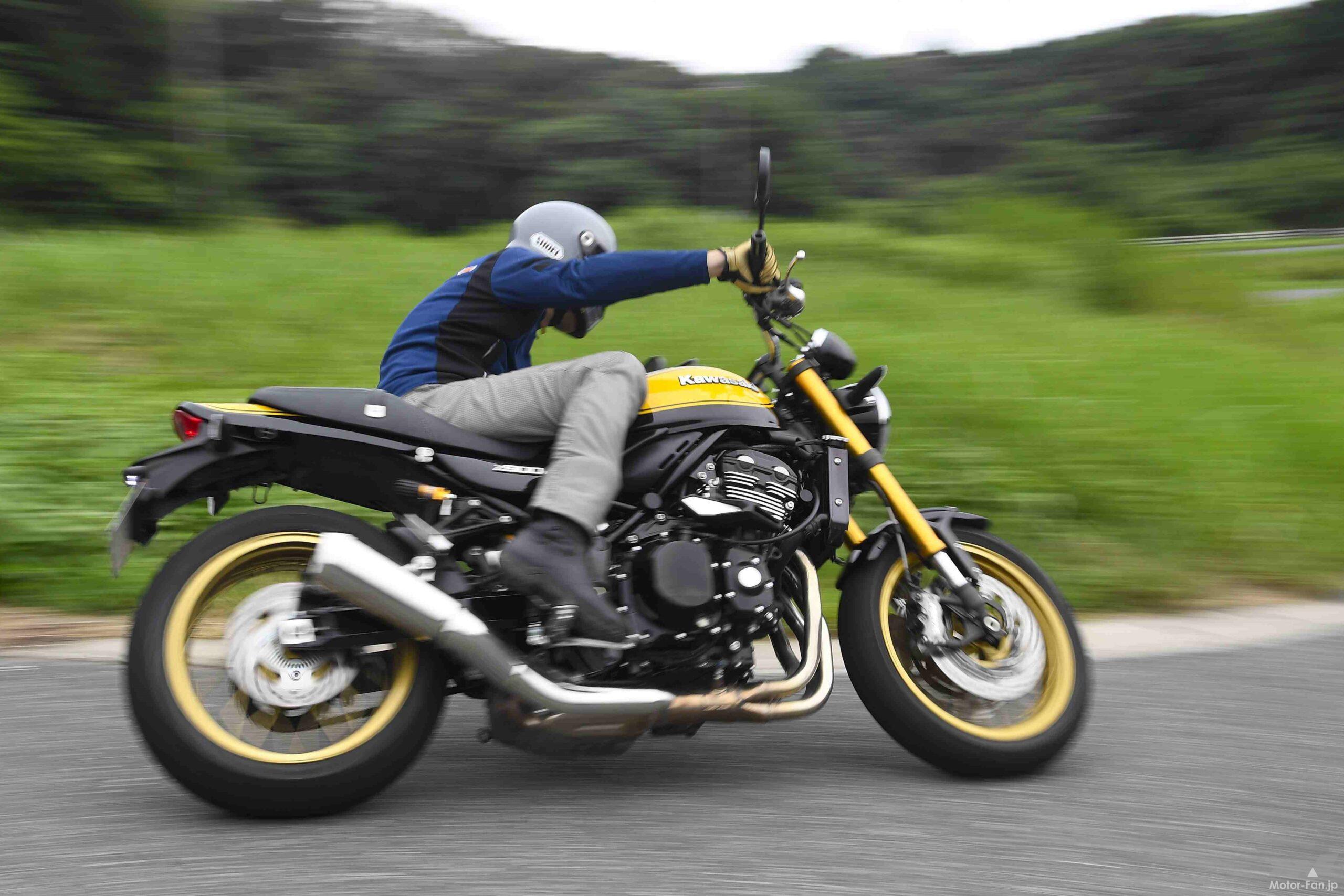 一方の車体に関して興味深いのは、低速域と高速域でハンドリングの印象が異なること。と言っても、低速域がヒラヒラ軽快で、高速域で十分な安定性が感じられることは、開発ベースのZ900だって同様なのだが、ワイドなアップハンドルや長めの軸間距離(Z900:1440mm、Z900RS:1470mm)などの効果なのだろうか、Z900RSシリーズのほうが軽快と安定の差異、メリハリは大きい。そしてその差異は、場合によってはライディングの楽しさを阻害する要素になるのだが、Z900RSシリーズにそういった気配はなく、むしろメリとハリのサジ加減が絶妙と思えた。