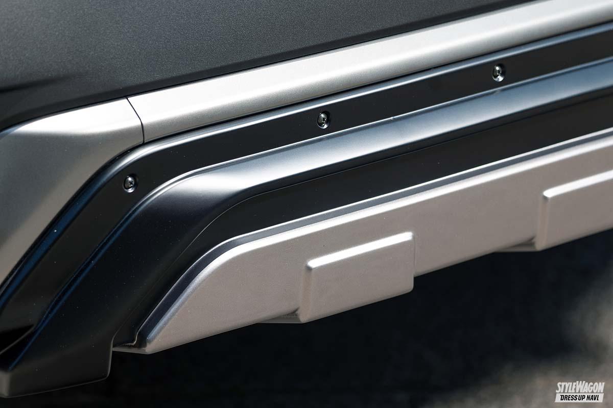 リアアンダースポイラーのセンターもフロント同様に、立体的なブロックデザインを採用。アウトドアフィールドにマッチする、オフロード感をプラスしてくれる。塗り分け塗装済みも設定あり。