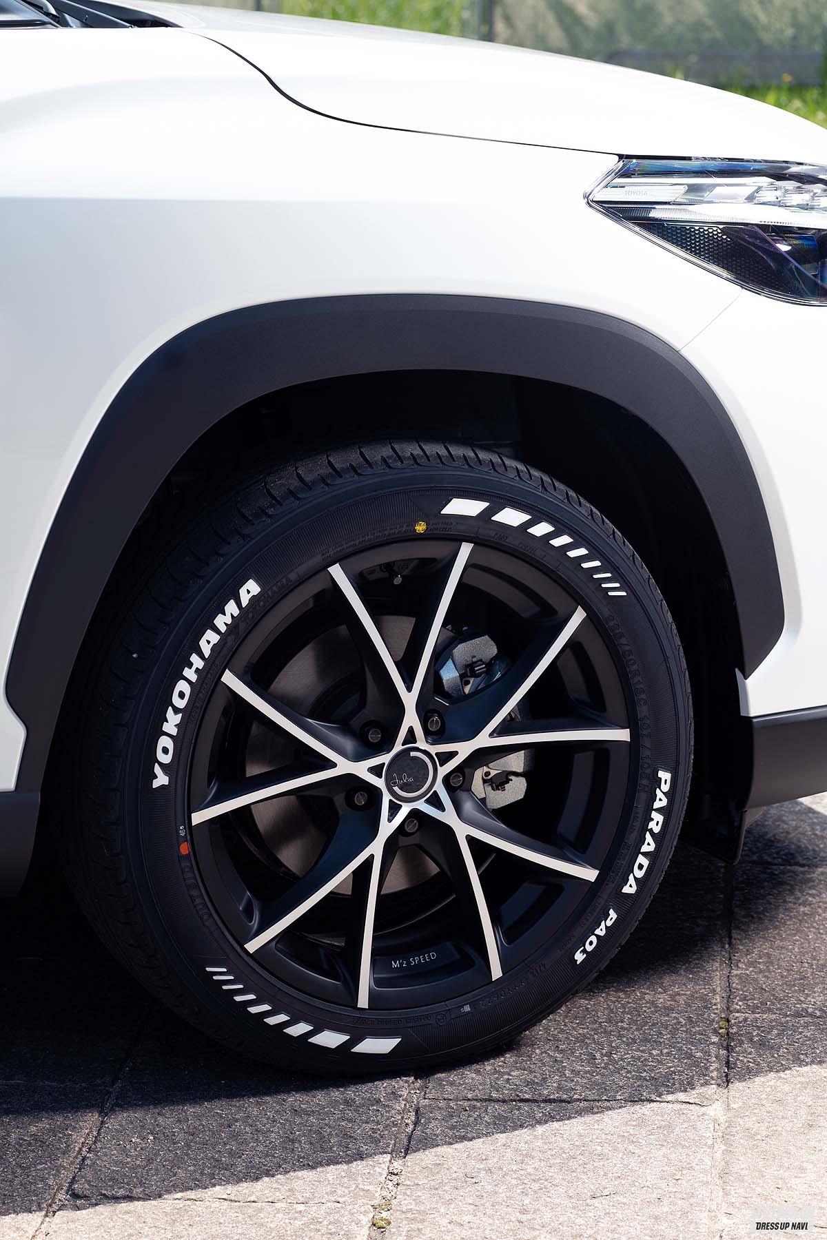 足元にはジュリア・フルスロットルの18インチとパラダPA03をセット。シャープなスポークとホワイトレタータイヤの組み合わせは、オフ系のスタイルにもマッチ。