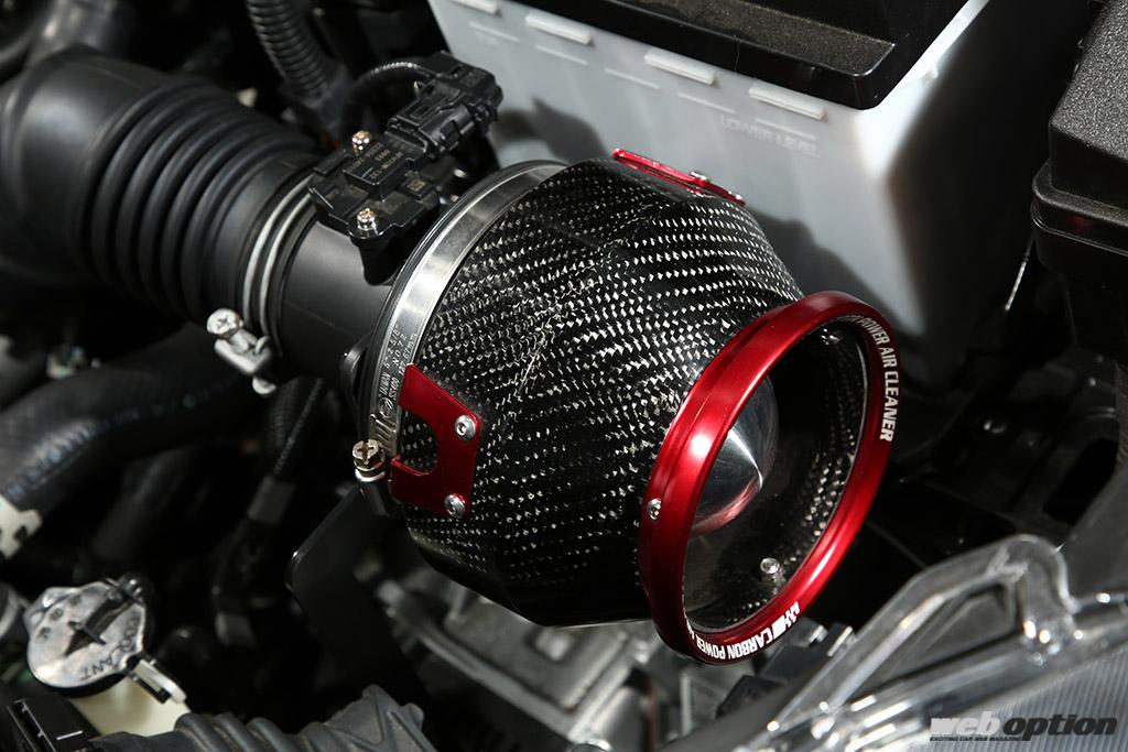 インテーク環境は、「カーボンパワーエアクリーナー(5万4780円)」で最適化。吸気効率を限界まで高めつつ、エンジンルームをレーシーに飾ることが可能な逸品だ。
