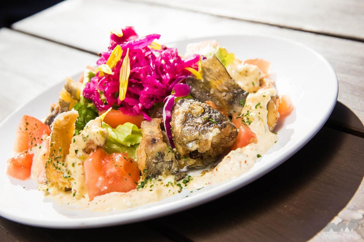 民間として国内で初めてヤマメの人工ふ化に成功したことから「ヤマメの郷」ともよばれる小菅村。源流レストランでもその味を楽しめます。「ヤマメのフリット」は、ヤマメが骨までサクッと揚げられた一皿。紫キャベツのマリネと菊が彩りを添えます。