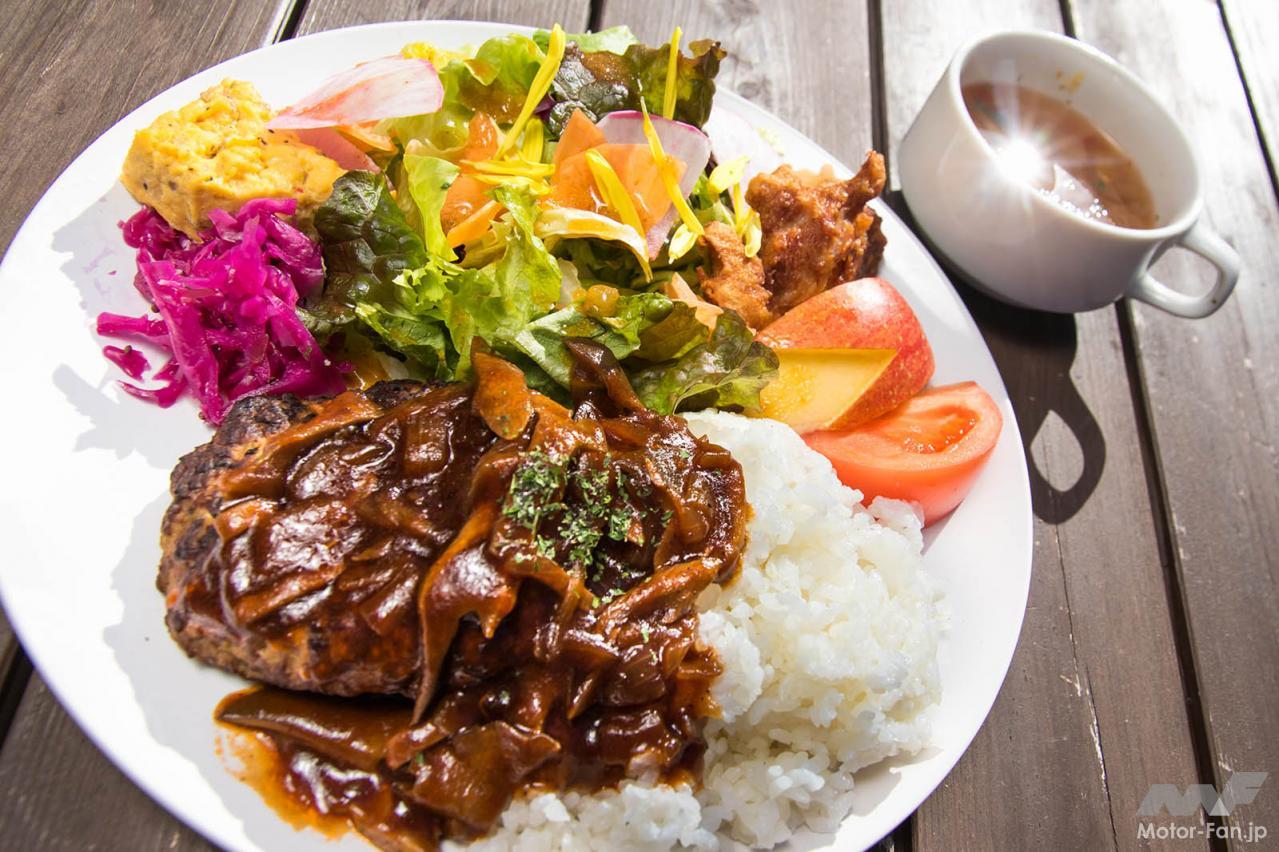 小菅村で捕獲された鹿を使った「鹿肉ハンバーグ」は色鮮やかなサラダとボリュームたっぷりのハンバーグがセットになったメニュー。ジビエ独特の臭みが少なくなるように、新鮮なうちに解体されているそう。小菅産のエゴマがかかったショコラとともに頂きました。