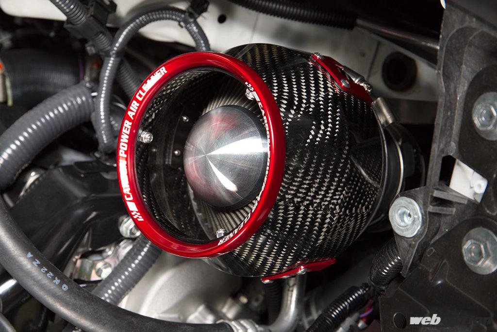 インテークには、ブラックとレッドのコントラストが美しいカーボンパワーエアクリーナー(10万980円)を装備。吸気効率の底上げはもちろん、ドレスアップとしても有効なパーツだ。