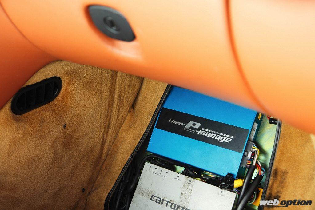 助手席の足元にセットされたeマネージ。専用ハーネスの設定は当然ないため、メインハーネスに配線を割り込ませて燃調をコントロールしている。