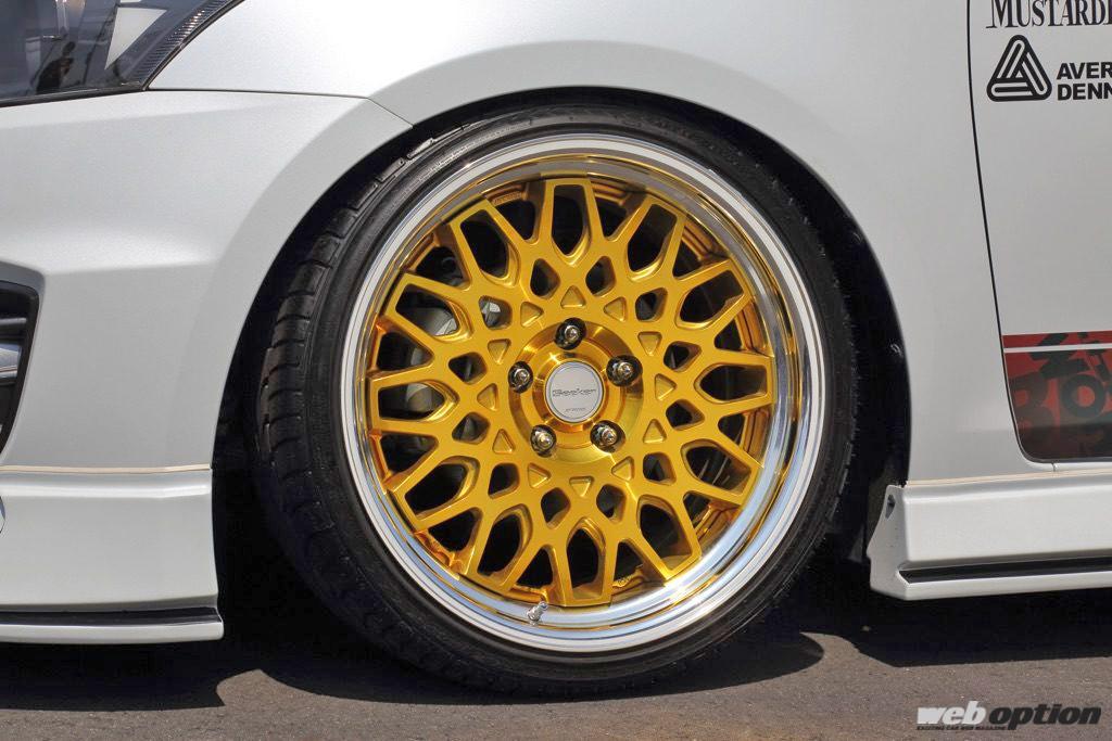 スタンス仕様の要となる足元は、フロント8.0、リヤ8.5JというサイズのワークシーカーCXインペリアルゴールドディスクをチョイス。ネオクラシックデザインがスイスポと絶妙のマッチングを見せる。