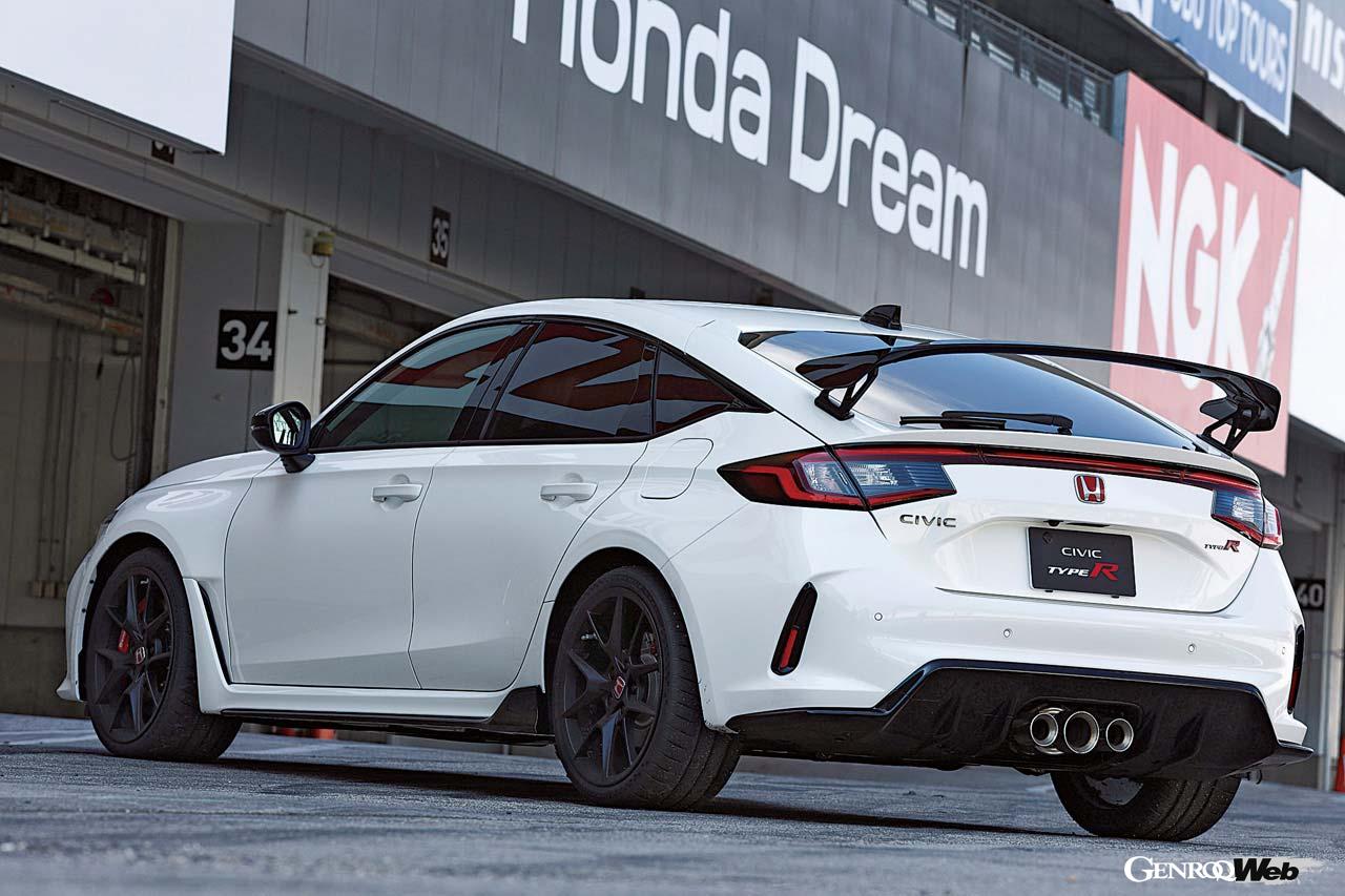 張り出したリヤフェンダーが端正にまとめられ、先代のガンダム的な雰囲気が減った。新型シビック・タイプRは端的に言ってシンプルかつ美しいデザインになったと感じる。プラットフォームは先代のキャリーオーバーとはいえ、先代と比較して、全長で20mm、ホイールベースで35mm長く、全幅が15mm幅広と全体に大型化した。一方全高は13mm低められているので伸びやかなフォルムとなったのは間違いない。