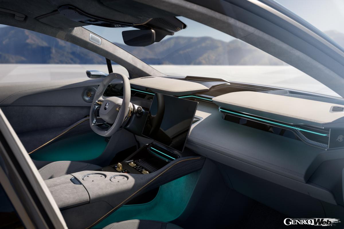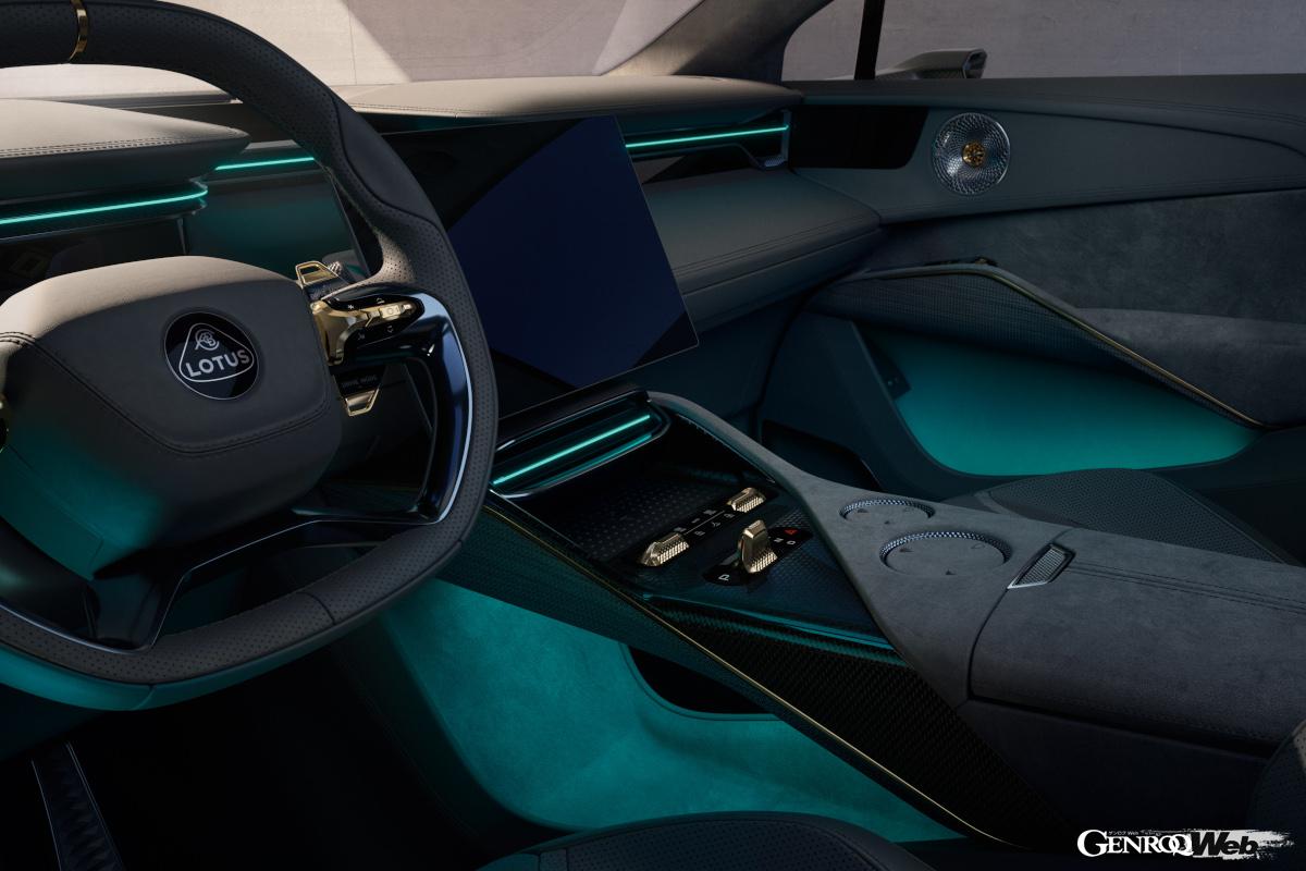 インパネにはロータスハイパーOSと名付けたデジタルコクピットを採用。これは、エピック・ゲームスのUnreal Engine(アンリアル エンジン)など、最新の技術を活用したもので、10億色の高度な超薄型フローティングタッチスクリーンを介して、様々な情報、サービスを提供する。