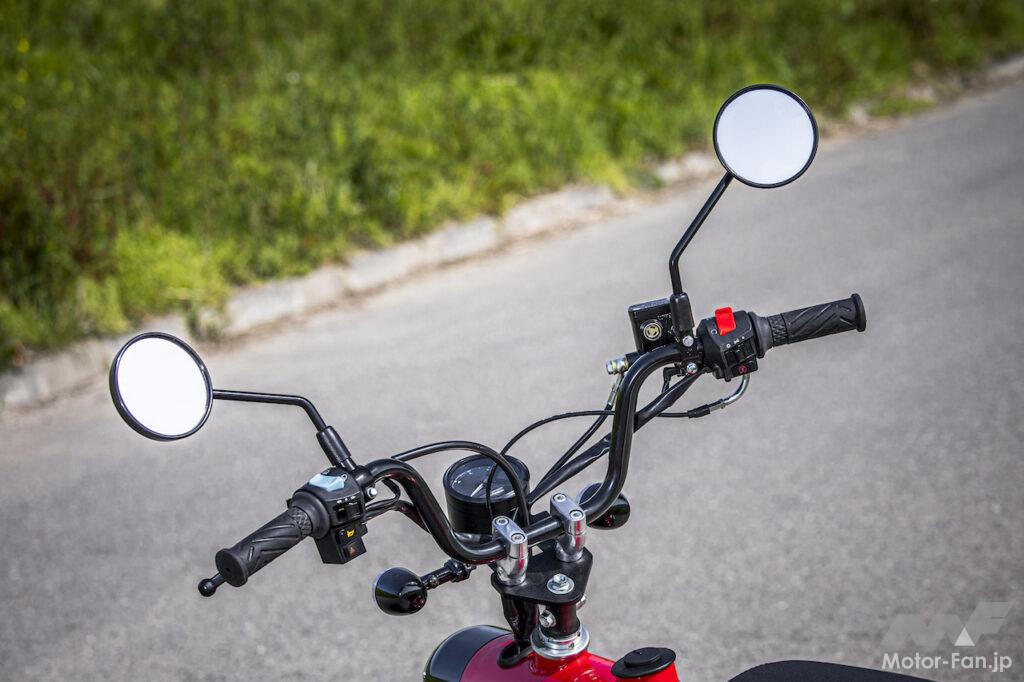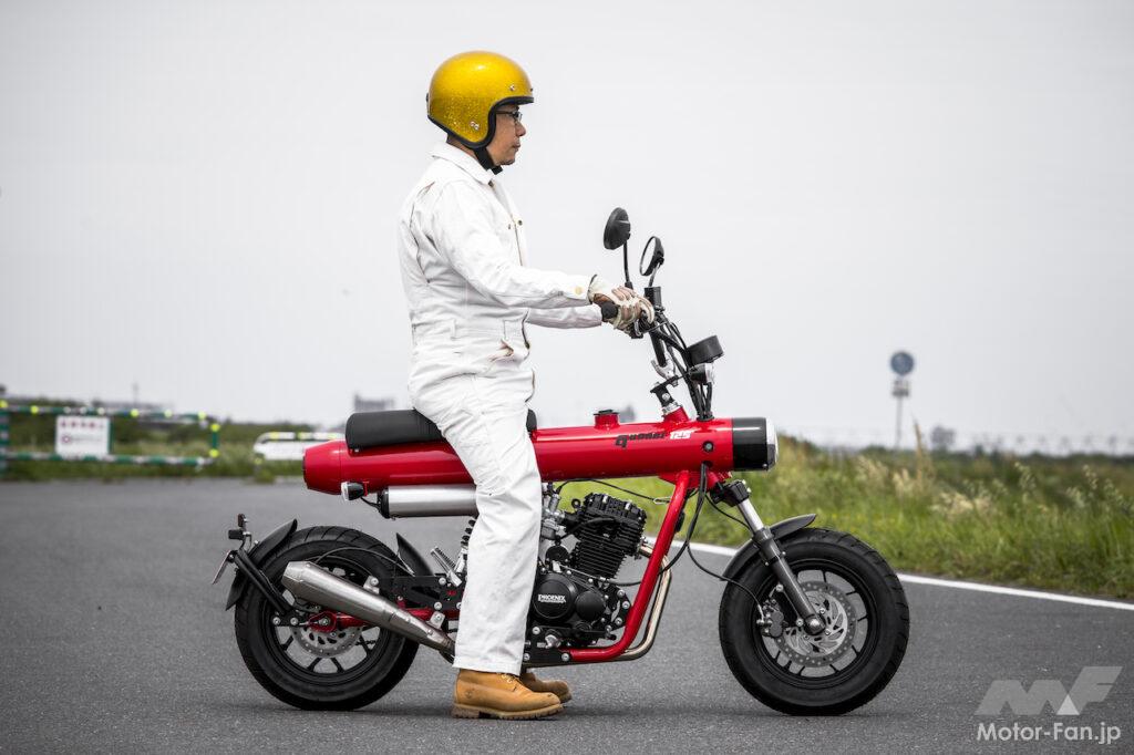 実際にまたがってみると、スリムなボディは見た目に感じるほど華奢ではない。前後12インチタイヤが遠目には“小さなバイク”と思わせていまうが、タイトなシートに着座して両手でハンドルを握ってみると、想像していたよりもずっとナチュラルなライディングポジションだ。「これはモーターサイクル」ということが直感できる。ボディの全長1770mmは、ホンダ・モンキー125のそれよりも60mmほど長い。