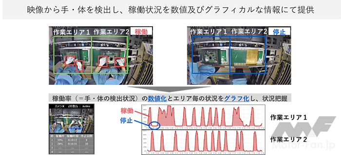 工場内に設置されたカメラの映像から、作業員の手や体の動きをNECの映像分析技術を活用して自動検出し、検出した時間を組立・検査工程における付加価値時間と換算して計測する。計測したデータから稼働率の数値化や作業エリアごとの状況のグラフ化を行うことで、工程間の関連性やボトルネックとなっている工程を分析することができる。これにより、製造ラインの人員配置の検討や作業員の育成を通して製造ラインの最適化を支援し、生産性向上に寄与する。