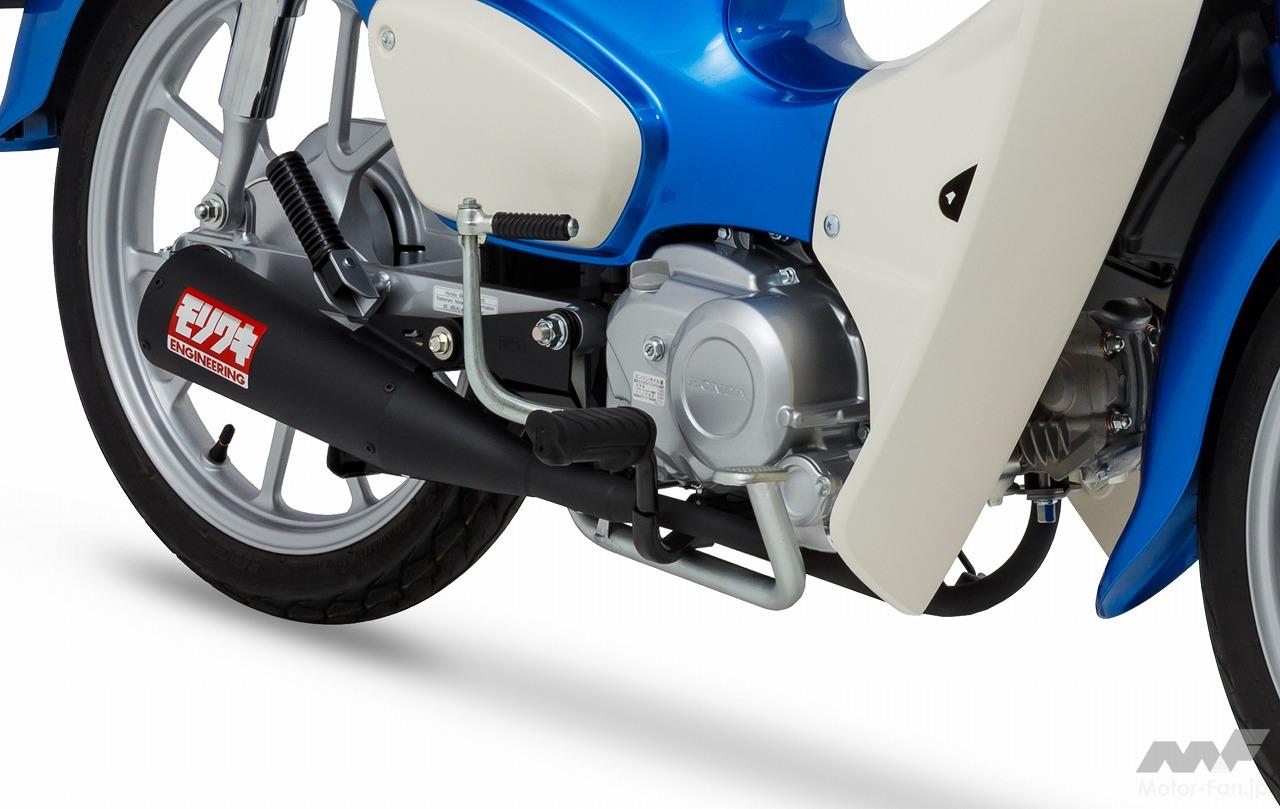現行のカブ110シリーズに適合するメガホンタイプのマフラーは、全体的にショートサイズかつファットなサイレンサーでキャストホイールの雰囲気にも良く似合う。