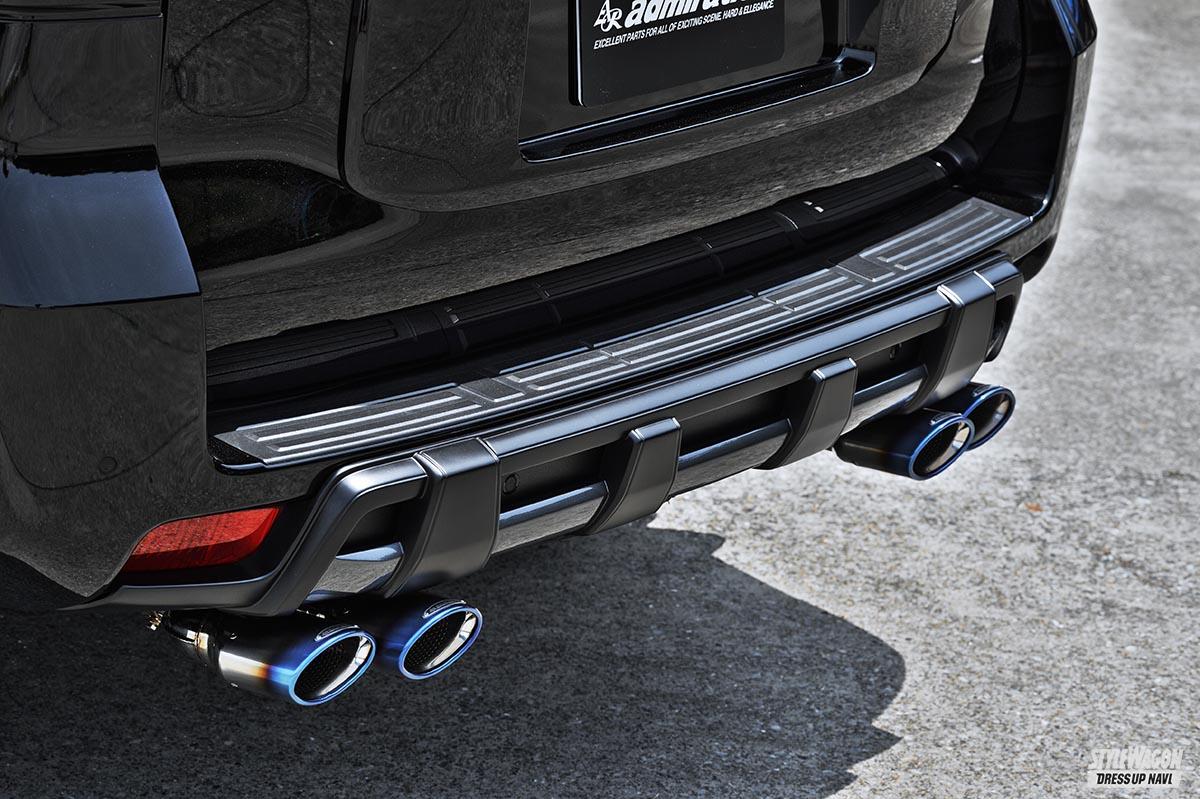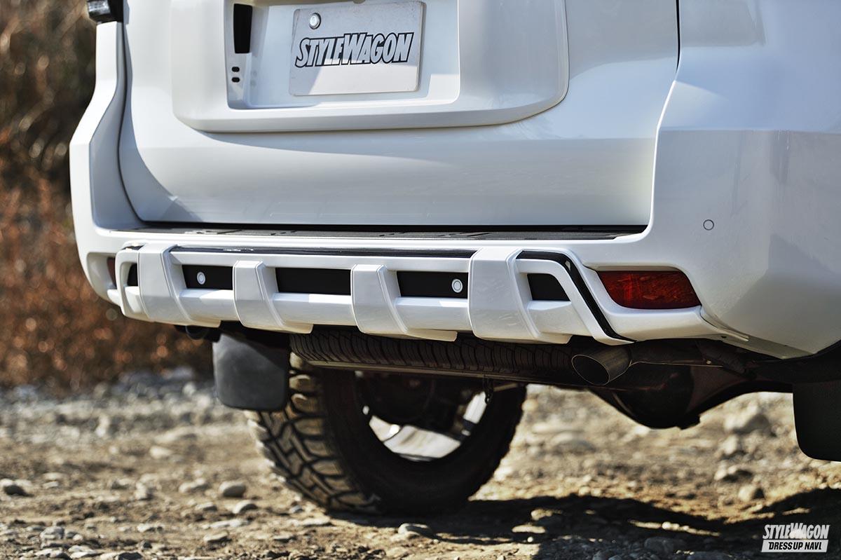 もともと地上高が高いプラドだけに、マフラー装着による見た目の変化も明確。ワンランク上のバックスタイルが手に入るのだ。150プラド後期のガソリン車とディーゼル車に対応し、同社ボディキット用と純正バンパー用がラインアップされる。