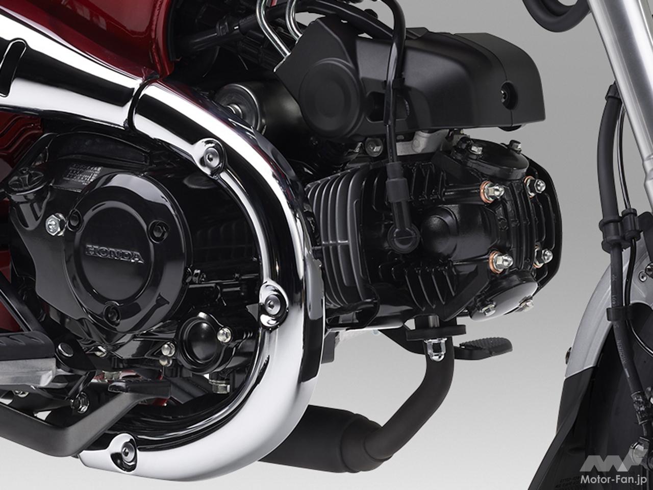 新排気ガス規制をクリアした新型のエンジンは、モンキー125やダックス125にも採用されている、ボア径50.0mm×ストローク長63.1mmのロングストローク型に変更。シリンダーヘッドやカバー類など、各部のデザインもチェンジされている。