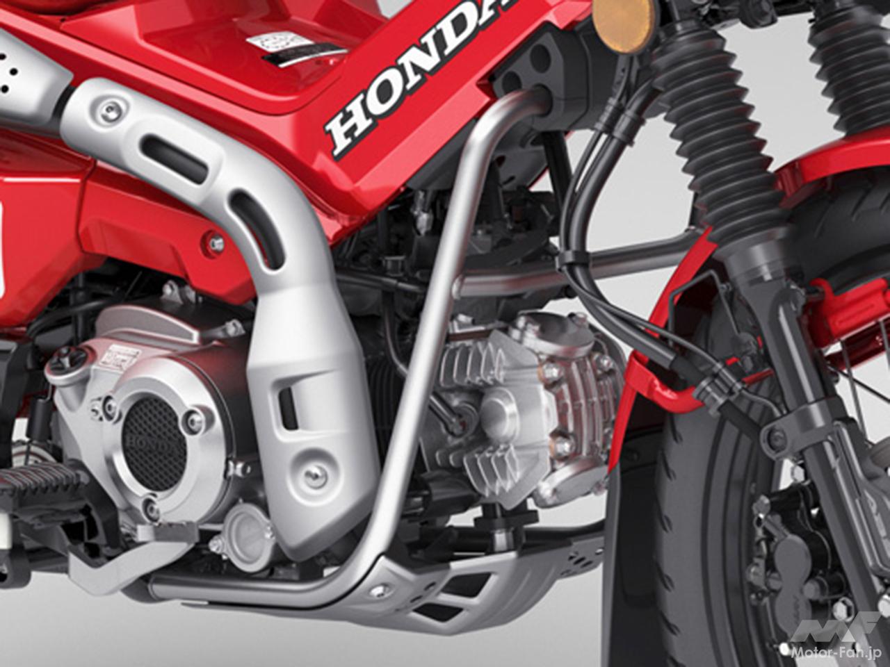 新型はメインフレームカバーに配置された「HONDA」ロゴを、黒の縁取りに変更してイメージチェンジ。カラーはタフなアウトドアアイテムをイメージした「マットアーマードシルバーメタリック」を新設定し、継続色の「グローイングレッド」「パールオーガニックグリーン」と合わせた全3色をラインナップ。なお、グローイングレッドのリアキャリアは、同色のレッドからブラックに変更された。