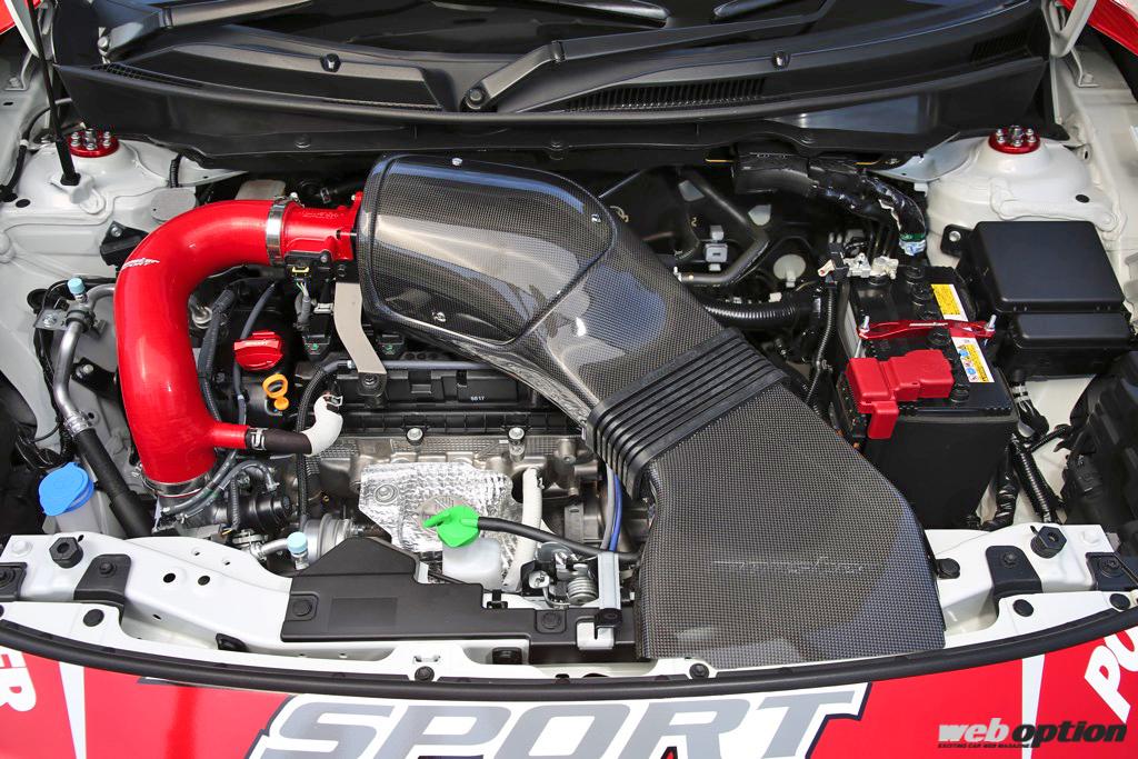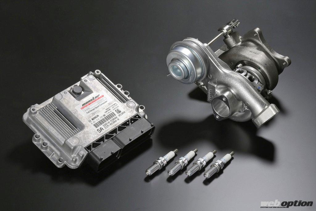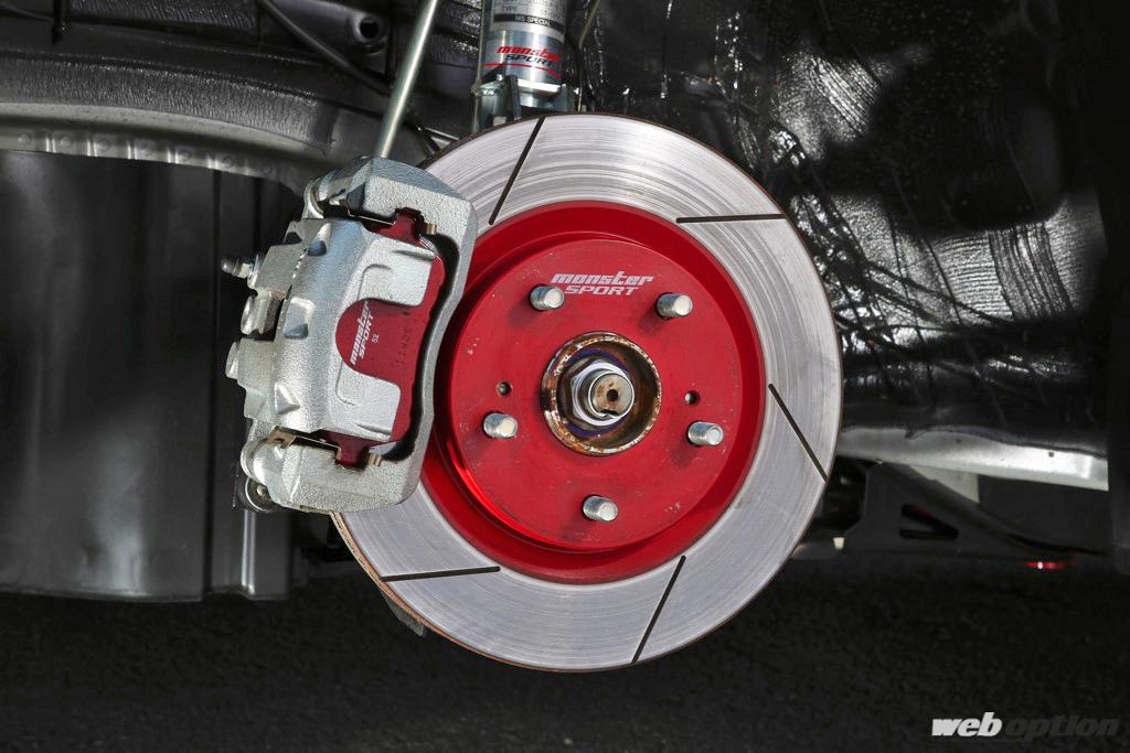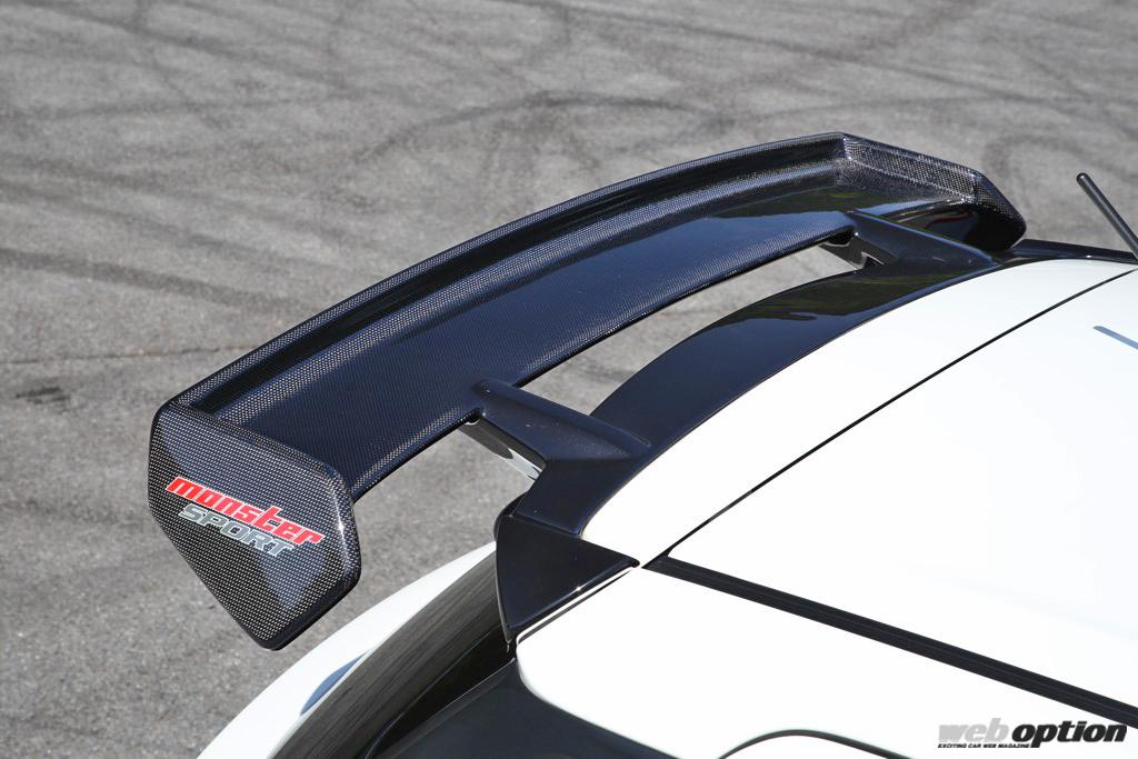 そしてエクステリアには、長年のモータースポーツ参戦ノウハウと風洞実験で開発したモンスタースポーツのエアロパーツで武装。カーボンGTウイングの他、リヤアンダースポイラー、エアアウトレット付きのカーボンボンネットなど、スポーツ走行時にはシッカリと空力効果を発揮してくれる。