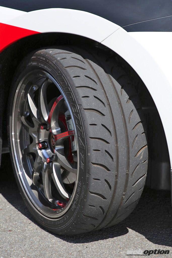 デモカーが装着しているホイールはボルクレーシングCE28SL(7.5J×17)で、タイやには前後215サイズのディレッツァZIIIを履く。ネガティブキャンバー角はフロント2度弱、リヤ約2度の設定だ。