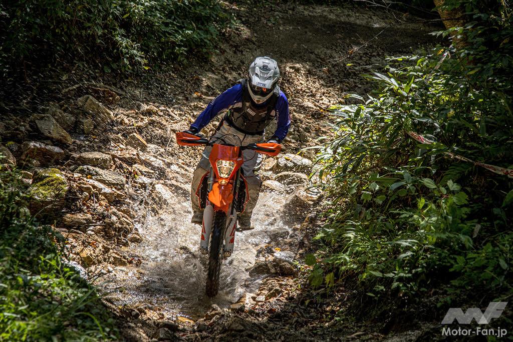 今回、エンデューロマシンということでモトクロスコースは走らず、エンデューロコースのみを試乗した。ここはギャップもあるけど、ガレ場や根っこ、丸太超え、川渡りなど変化に富んでおりまさにエンデューロ。ハイスピードでは走れないけど、その分低中速域での走破性や扱い特性がはっきり出る感じだ。まず感じたのはサスペンションの動き。細かいギャップでも良く動いてはいるのだけど、全体として硬めに感じた。エンデューロといってもモトクロスコースの様な路面をハイスピードで走る場面も多いので、余り柔らかい方向にセッティング出来ないのは分かる。しかし丸太越えやガレ場、根っこがある轍などではもう少し柔らかくセッティングした方がライダーへの負担は減って乗りやすくなるのではと思う。勘違いしないで欲しいのは、ノーマルセッティングのままでも跳ねまくるとかタイヤのグリップを失うとかが起きることは無く、十分以上の走破性は持っているということ。細かいターンやガレ場でのターンなどすこぶる扱いやすく、思いのままにラインをトレースしてくれた。まー私のレベルではということだが。これがトップエンデューロレーサーでは違った感想になるかもしれない。
