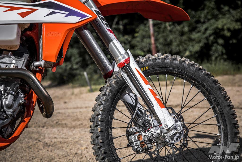 KTMのエンデューロマシンはリンク無しの直付リヤショックとなっているが、何ら不足は無いしメンテ性も高くて素晴らしい。リヤもフロントもフルアジャスタブルなので、体重や好みにしっかり合わせられる。さらにステアーケースや岩などに亀になった時、丸太超えでもリンクが無いのは当たる物が無いということで、こういう点での安心感は絶大なものだ。総合的に完成度が一段と上がったマシンであった。私的にはシート高だけが気になった点である。