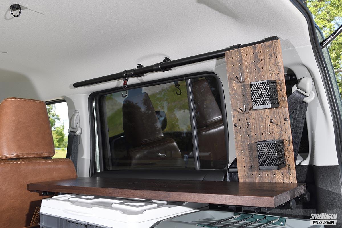 基本的にパーツは自分たちで装着しているが、最近ではイチからモノを作るDIYにも挑戦。例えばサイドテーブルはアカシア集成材やイレクターパイプなどを活用して自作。こちらはテーブルの置き場所を変更するだけで、ラゲッジボードに早変わり。