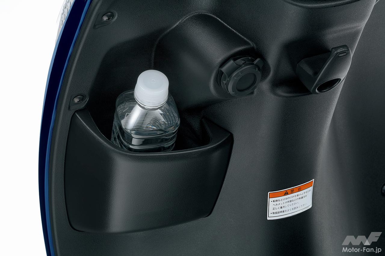 シート下には収納に便利なトランクスペースを確保(容量:21.8L/最大積載許容重量:3kg)。また、ヘルメットホルダーを左右に1個ずつ装備。