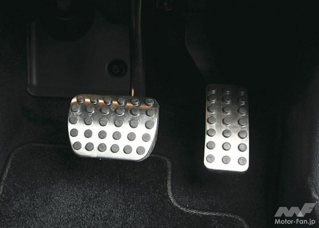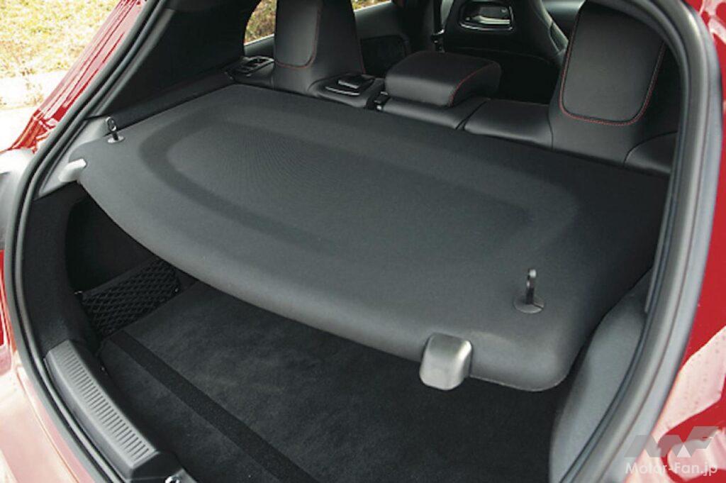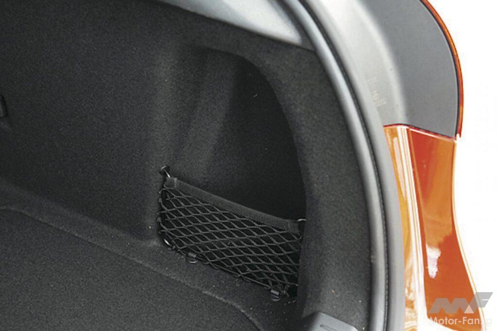 着座位置が低いフロントシートは沈み込むように乗り込む感覚。ドアの開き方などの工夫により、ドアを開く軸となるヒンジ付近(ドア前方)でもドア開け時に車体とドアの隙間が広めなので乗降姿勢のわりには足先がドアトリム下に接触しにくく、足の出し入れがしやすい。後席は前席に比べると足元の空間が少ないが、このクラスとしては平均的な水準。一方の頭上は、開口部の天井付近が水平に近い(後方に向かって下がっていない)ので頭をぶつけにくいのが好印象である。前席開口部に装着されているステップカバーはイルミネーション付きだ。