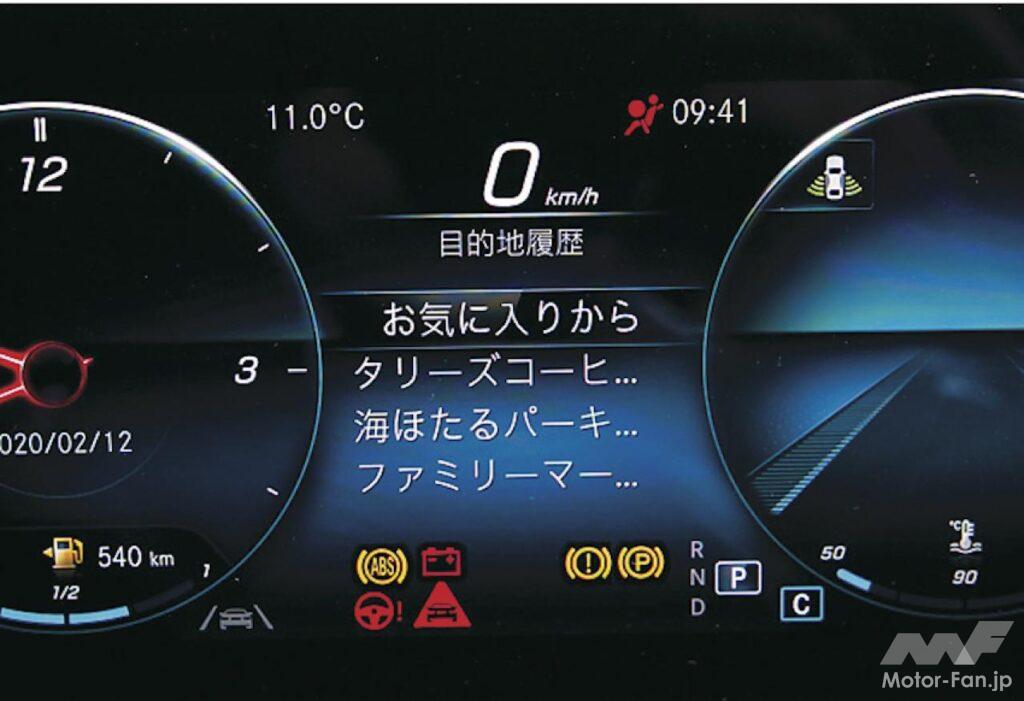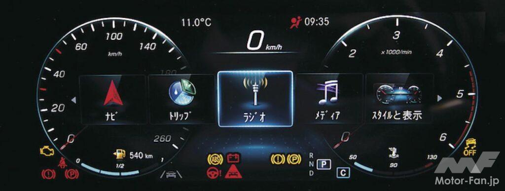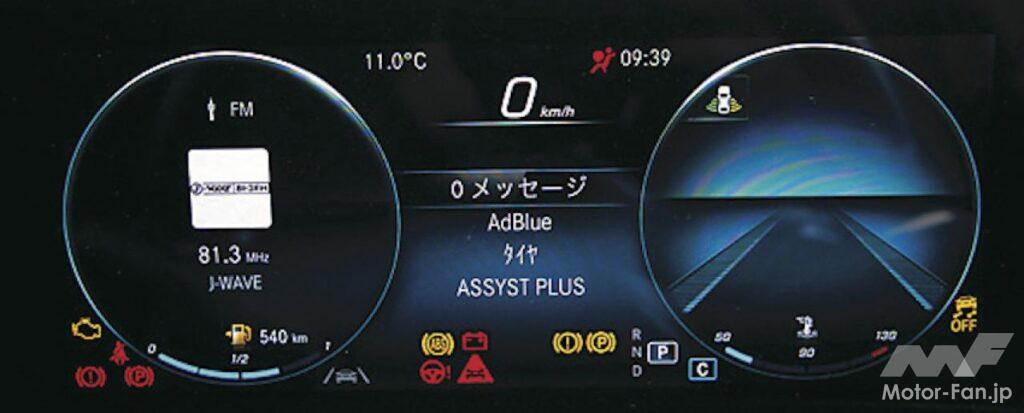 フル液晶メーターの特徴でありアナログメーターには真似できない高機能といえるのが、表示を変化させることだ。Aクラスでもメルセデスの上位モデルと同様に、表示を左右と中央の3つのエリアをそれぞれにわけてオーナーの好みに応じて表示項目を選択できる。