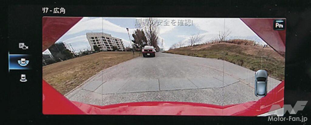パーキングアシストリヤビューカメラは通常の画角のほか、左右約180度まで見渡せる広範囲の画面にも切り替え可能。通常画面では、ステアリング操作に連動した進路予測線に加え、センサーからの情報に基づいた障害物の注意喚起(黄色や赤の線)もあわせて画面上に表示する。オプションで車両全周囲を映す「360°カメラシステム」も用意している。