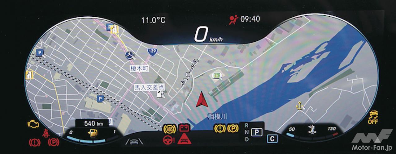 従来のメーターの概念から抜け出した、10.25インチの横長のフル液晶メーターがドライバーを未来へと誘う。しかし、見逃せないのは単に先進的というだけではなく、高い機能性が備わっていることだ。パネルサイズは左右310 ㎜×高さ120 ㎜と大きい。
