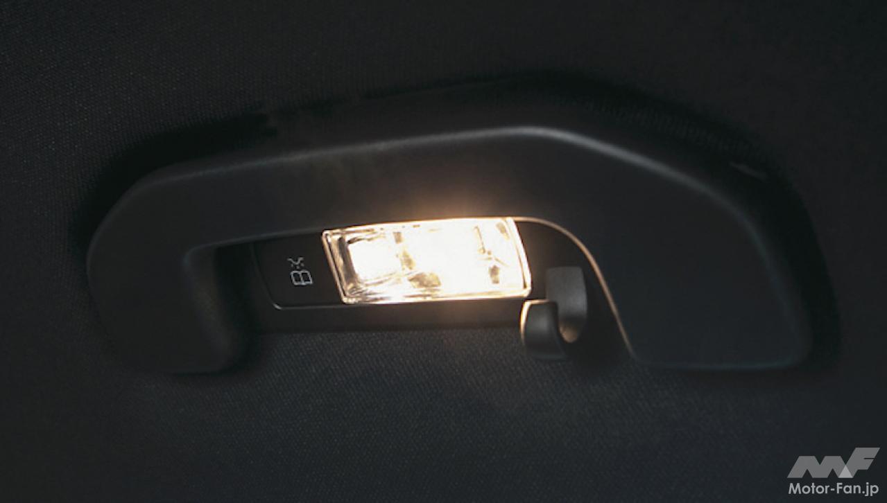 着座位置が低いフロントシートは沈み込むように乗り込む感覚。ドアの開き方などの工夫により、ドアを開く軸となるヒンジ付近(ドア前方)でもドア開け時に車体とドアの隙間が広めなので乗降姿勢のわりには足先がドアトリム下に接触しにくく、足の出し入れがしやすい。後席は前席に比べると足元の空間が少ないが、このクラスとしては平均的な水準。一方の頭上は、開口部の天井付近が水平に近い(後方に向かって下がっていない)ので頭をぶつけにくいのが好印象である。前席開口部に装着されているステップカバーはイルミネーション付きだ。