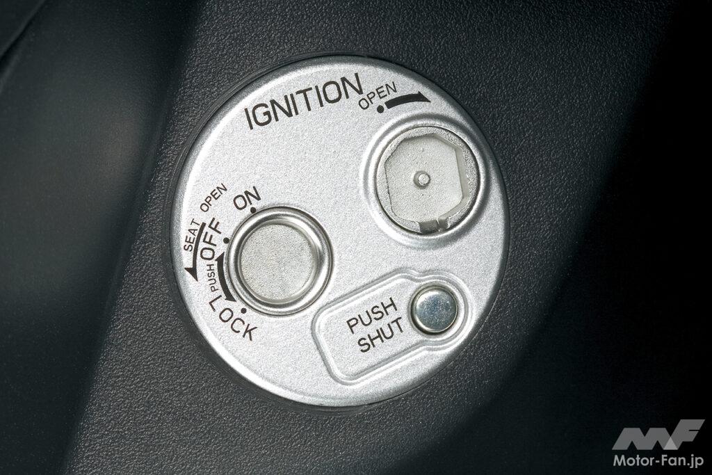鍵穴へのいたずらや盗難を抑止する、シャッター付きのキーシリンダーを装備。キーシリンダーは、シートオープンと一体になった集中ロック式を採用。また、ワンプッシュでシャッターを閉め、鍵穴をしっかりガードする新しい機構も導入済み。