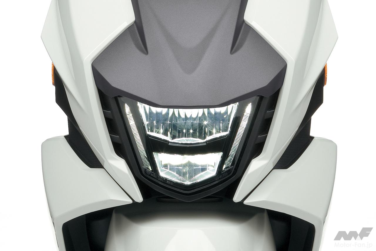 テールへと跳ね上がるウェッジシェイプは、機敏な走りのイメージにデザイン。パネルを合わせたような部品構成は、面質にこだわることで上質感を演出。広いフラットなフロアボードにより、足元に窮屈さを感じることなく、自由度の高いライディングポジションを実現しているのもポイント。