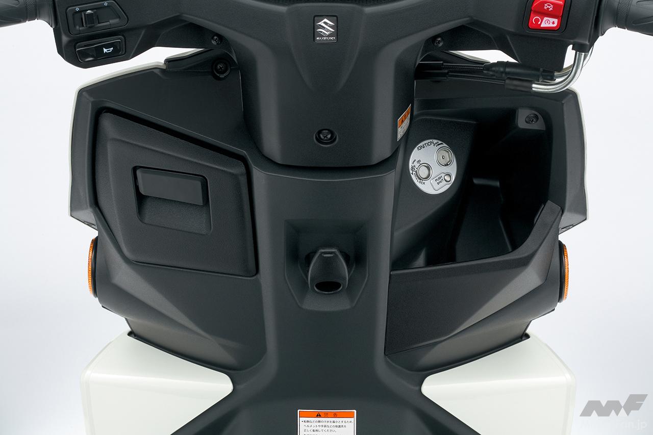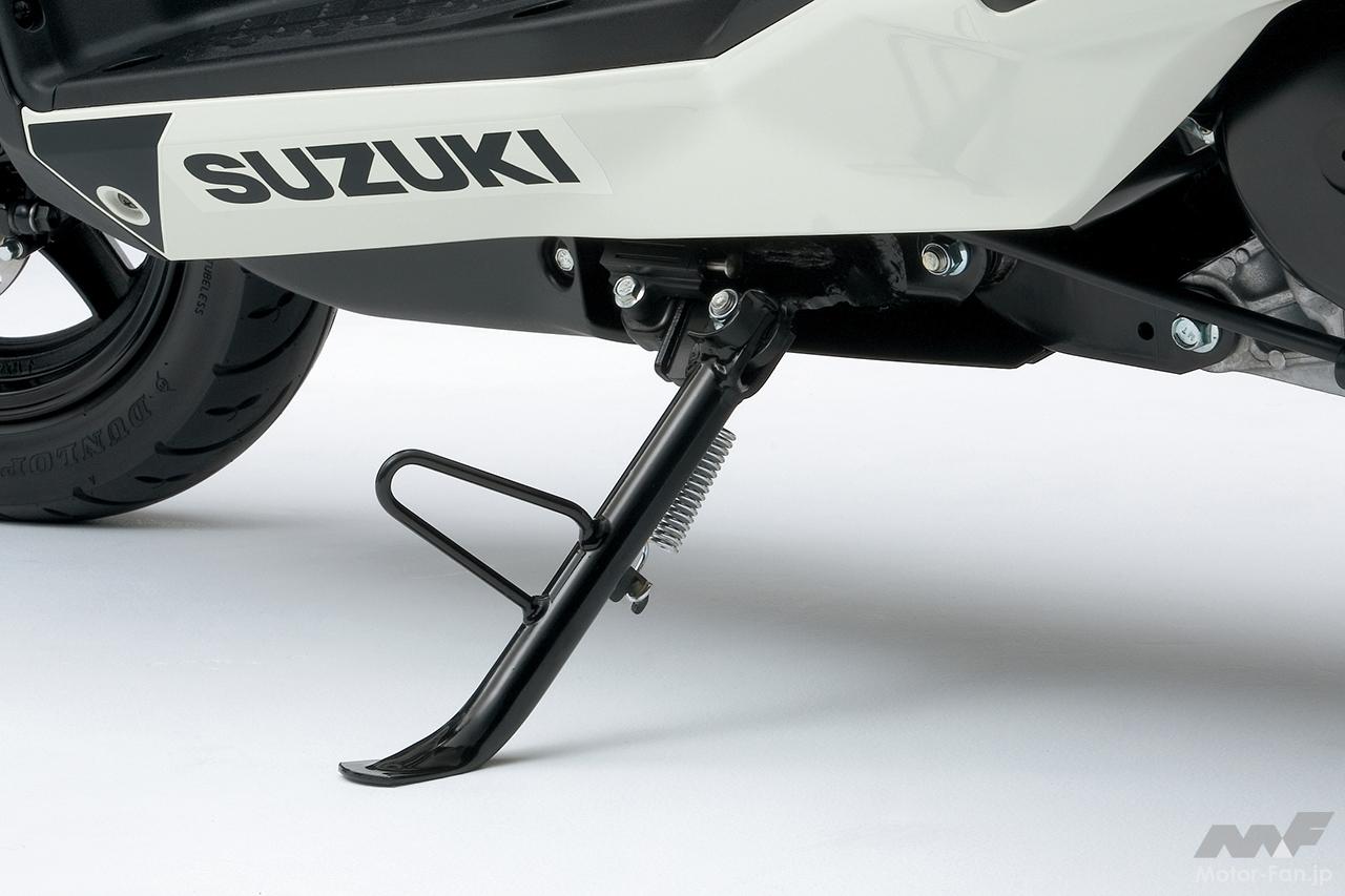 リヤフェンダーに加え、インナーフェンダーを装備することにより、雨水等の跳ね上がりの低減に貢献。また、ワンプッシュで始動可能なスズキイージースタートシステムを採用。転倒などの非常時に、ただちにエンジンを停止できるエンジンストップスイッチも装備済み。